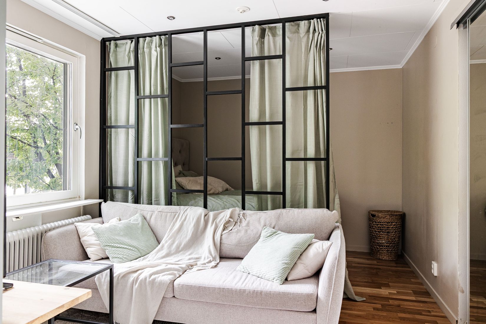 Allrummet är smart disponerat med en skiljevägg som skapar två naturliga sektioner – en mysig sovdel och en trivsam vardagsrumsdel med plats för soffa, tv-möbel och annat möblemang. Förvaringsmöjligheterna är generösa tack vare garderob med skjutdörrar.