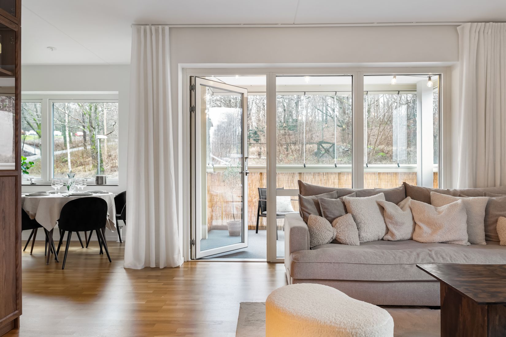 Här finner ni bland annat genomgående parkettgolv, ljusa väggar, mycket fina förvaringsmöjligheter tack vare skjutdörrssystem och en rejäl klädkammare, en mycket stor inglasad balkong med bra solläge, fina tillval och en kvadratsmart planlösning.