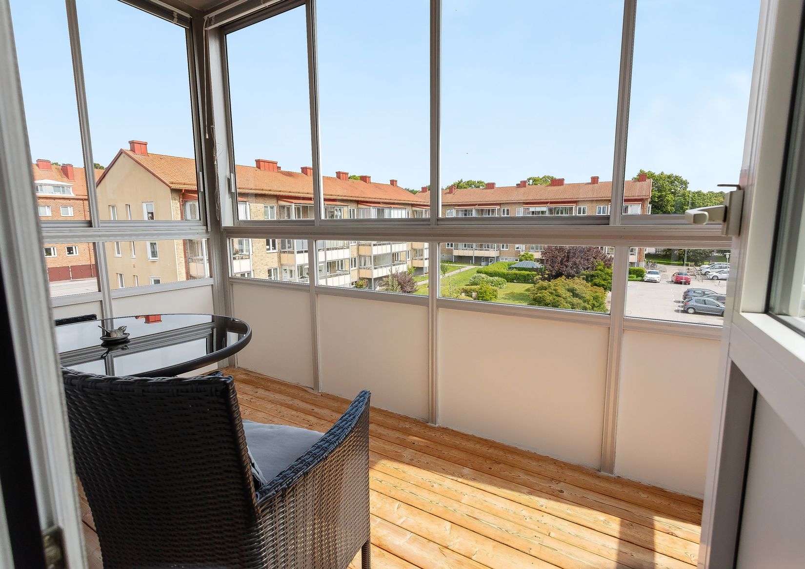 Lägenheten erbjuder två rymliga sovrum, ett stort och hemtrevligt vardagsrum samt ett kök med gott om förvaring och arbetsyta. Den inglasade balkongen blir ett extra rum större delen av året – perfekt för morgonkaffet, en god bok eller kvällsmiddagar med utsikt över stadens takåsar.