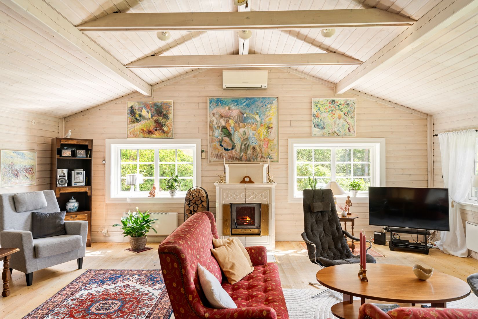 Det tidigare vardagsrummet bjuder på öppen spis och plats för den sköna läsfåtöljen, härifrån nås den träbelagda altanen med sydvästläge där solen trivs från morgon till kväll.
