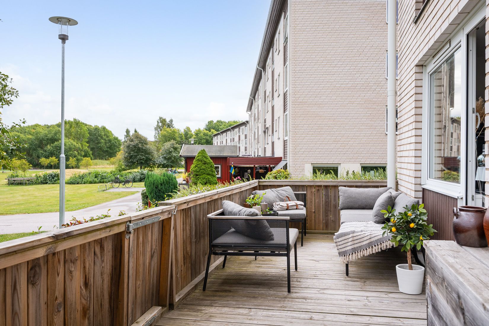 Uteplatsen disponeras om ca 20 kvm med fin belägenhet mot områdets gröna omgivningar. Här finns goda utrymmen att möblera med matplats och en loungegrupp för den som önskar!