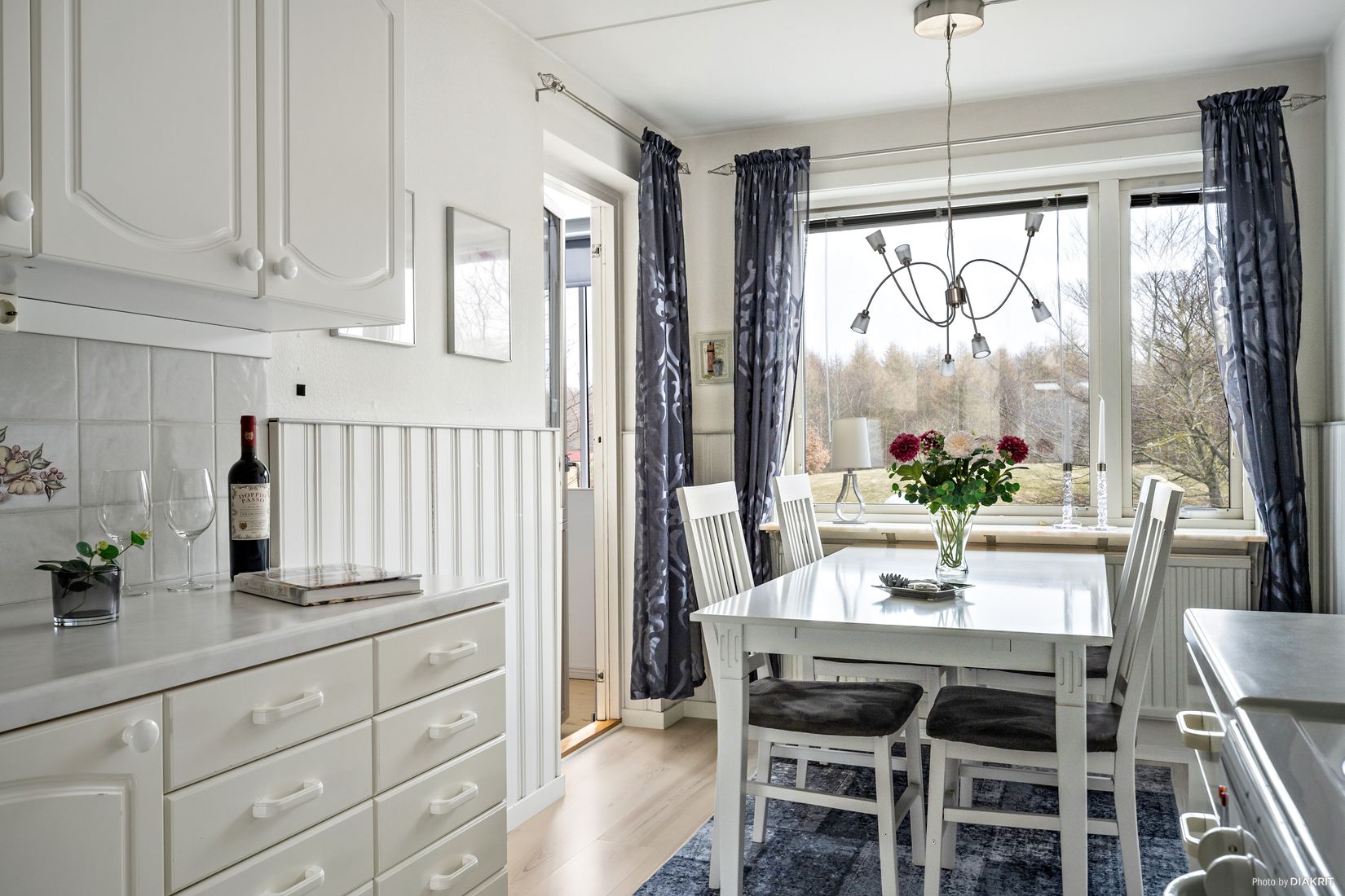 Redan i entrén möts man av den ljusa och inbjudande känslan som genomsyrar detta boende. Här finns gott om plats att hänga av sig ytterkläderna och till höger finns bostadens badrum. Badrummet är utrustat med duschkabin, toalett, handfat med en stor kommod samt ett spegelskåp för extra förvaring. Tvättpelaren med en tvättmaskin från Electrolux och en torktumlare från Siemens gör vardagen extra smidig. Köket är både ljust och funktionellt med goda arbetsytor och gott om plats för matbord vid det stora fönstret. Utrustningen består av diskmaskin från Siemens, kyl och frys från Electrolux, ugn från Husqvarna samt en fläkt. Den ljusa inredningen och kaklet ovanför arbetsytorna ger en fräsch och stilren känsla. Från köket nås den inglasade balkongen som blir ett extra rum stora delar av året, här kan såväl morgonkaffet som kvällslugnet avnjutas, en riktig favoritplats med fri utsikt över de grönskande omgivningarna. Vardagsrummet är rymligt och lättmöblerat med parkettgolv och vitmålade väggar. De generösa fönsterpartierna släpper in rikligt med dagsljus och skapar en luftig och behaglig miljö, perfekt för både avkoppling och sociala tillställningar. Bostaden erbjuder två sovrum. Det större sovrummet har plats för en rejäl säng och präglas av ljusa väggar samt en effektfull fondvägg som ger rummet karaktär. Det andra sovrummet är även detta ljust med vitmålade väggar och laminatgolv. Här finns plats för både säng och skrivbord vilket gör att rummet passar idealiskt som barnrum, gästrum eller hemmakontor. Förvaringsmöjligheterna är utmärkta med en stor klädkammare som i dag används som en praktisk walk-in closet samt ett utvändigt förråd precis utanför lägenhetsdörren.