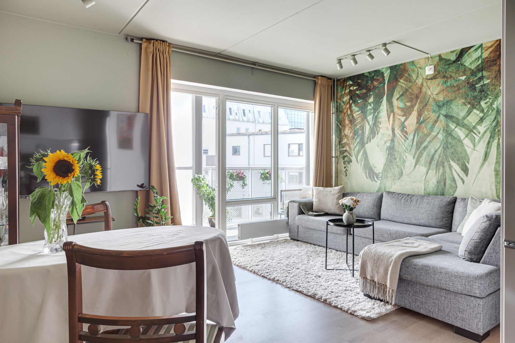 Vardagsrummet är ovanligt rymligt för sin storlek och erbjuder plats för både en större soffgrupp och en generös säng i den smart avgränsade sovalkoven. De stora fönstren släpper in härligt med ljus och leder ut till hemmets hjärta – den sällsynt stora balkongen i soligt söderläge. Här finns plats för både matgrupp, loungemöbler och odling om så önskas.
