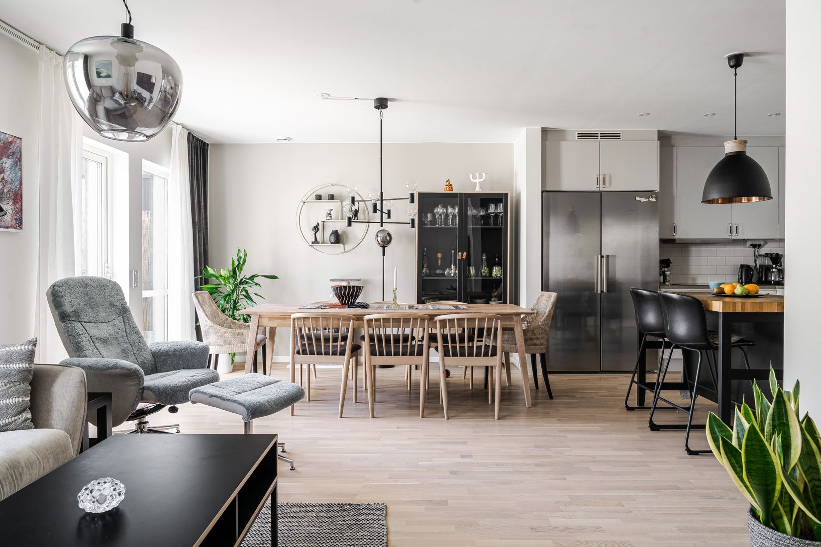 Här bor Ni bekvämt med 122,4 kvadratmeter fördelade på två plan och en smart planlösning som erbjuder stora sociala ytor i vardagsrum och kök. I vardagsrummet inryms större soffmöblemang för hela familjen till fredagsmyset samtidigt som den rejäla matplatsen inbjuder till trevliga middagar med kära vänner. Härifrån finns också utgång till trädgården i form av trädäck med bra plats för utemöbler, en rejäl grill och loungemöbler. I bostaden finner Ni vidare två helkaklade badrum, tre sovrum, allrum (som kan göras om till sovrum vid behov), bra klädkammare under trapp och en praktisk, separat tvättstuga.