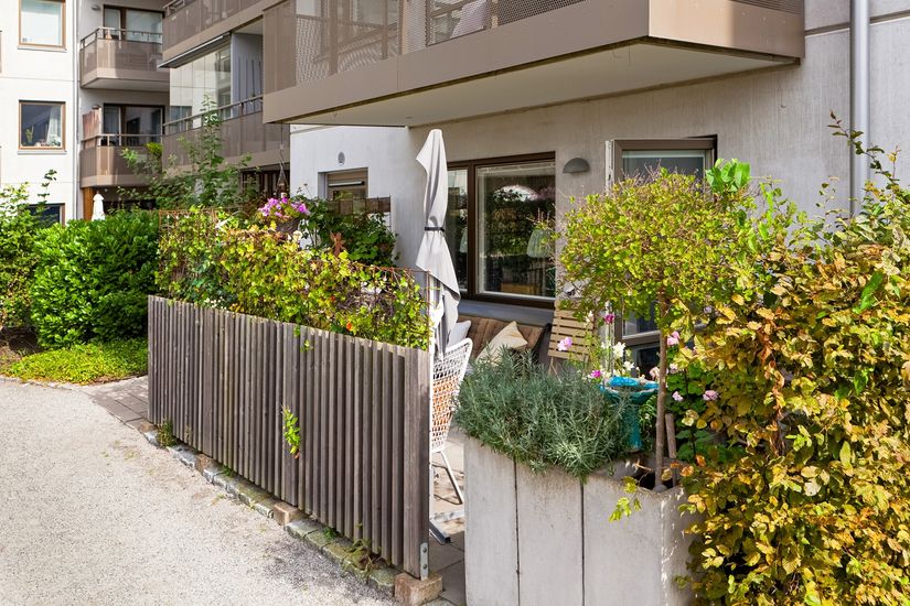 Den generösa uteplatsen om ca 13 kvm ligger i soligt västerläge, gott om plats för matplats och sittgrupp.