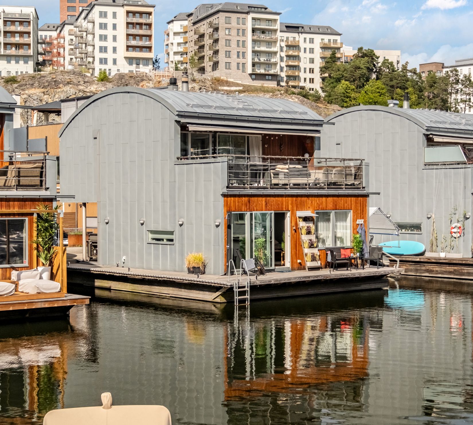 Ett boende för dig som drömmer om ett liv vid vattnet - En kombination av arkitektur, komfort och en livsstil där havet är en naturlig del av vardagen. Här får du känslan av att bo i skärgården men med innerstadens puls bara några minuter bort via båt, buss eller bil. Garageplats finns för både elbil och vanlig bil och med egen båt intill huset tar du dig snabbt ut på havet och till Stockholms Skärgård.