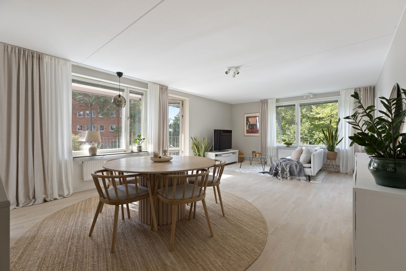 Den halvöppna planlösningen mellan kök och vardagsrum skapar en social yta perfekt för både middagar och umgänge. Stora fönster i flera väderstreck låter ljuset flöda in och förstärker känslan av rymd. Köket är smakfullt inrett med gott om arbetsyta och generös förvaring, medan vardagsrummet blir en naturlig samlingspunkt för hela familjen.