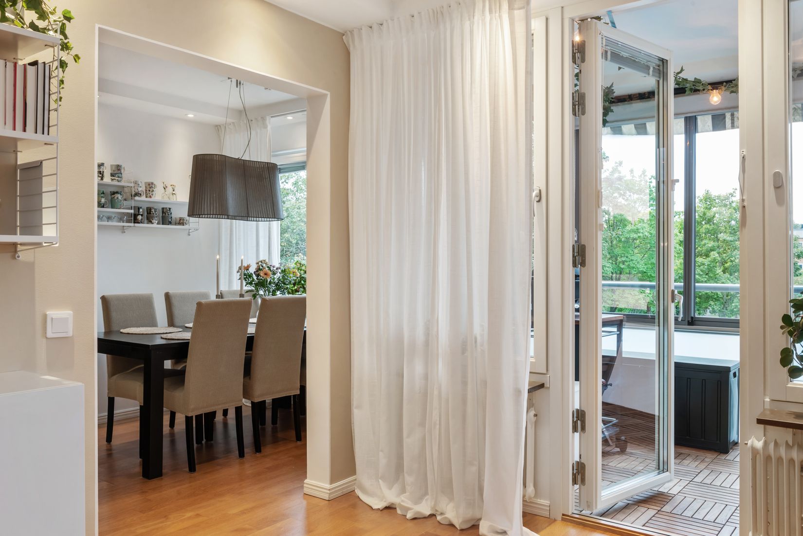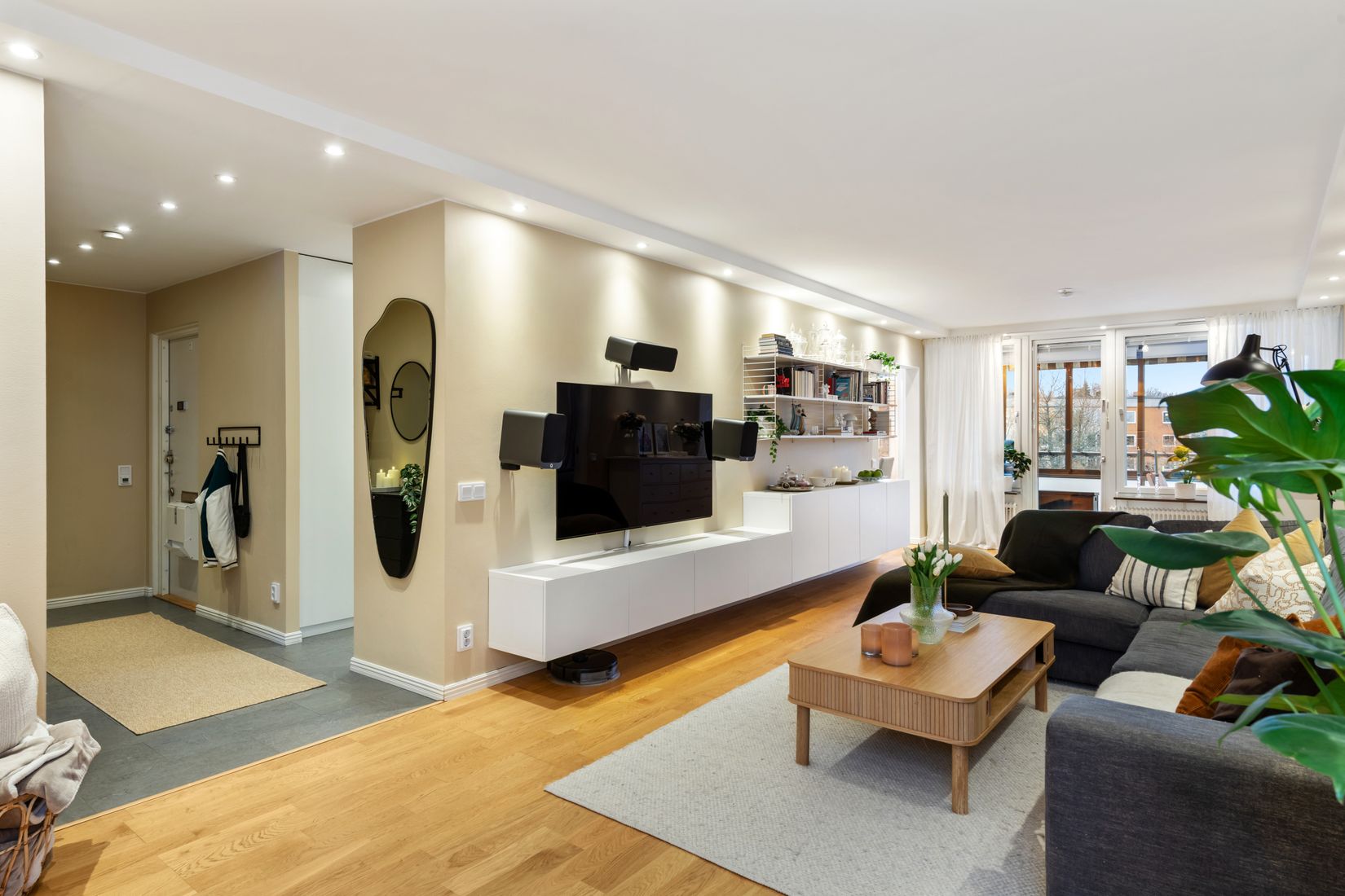 Det rymliga vardagsrummet är lägenhetens hjärta, med generösa ytor för både soffgrupp och matsalsdel. Härifrån nås den stora dubbelbalkongen med eldriven markis – perfekt för härliga middagar i eftermiddagssolen med utsikt över gården.