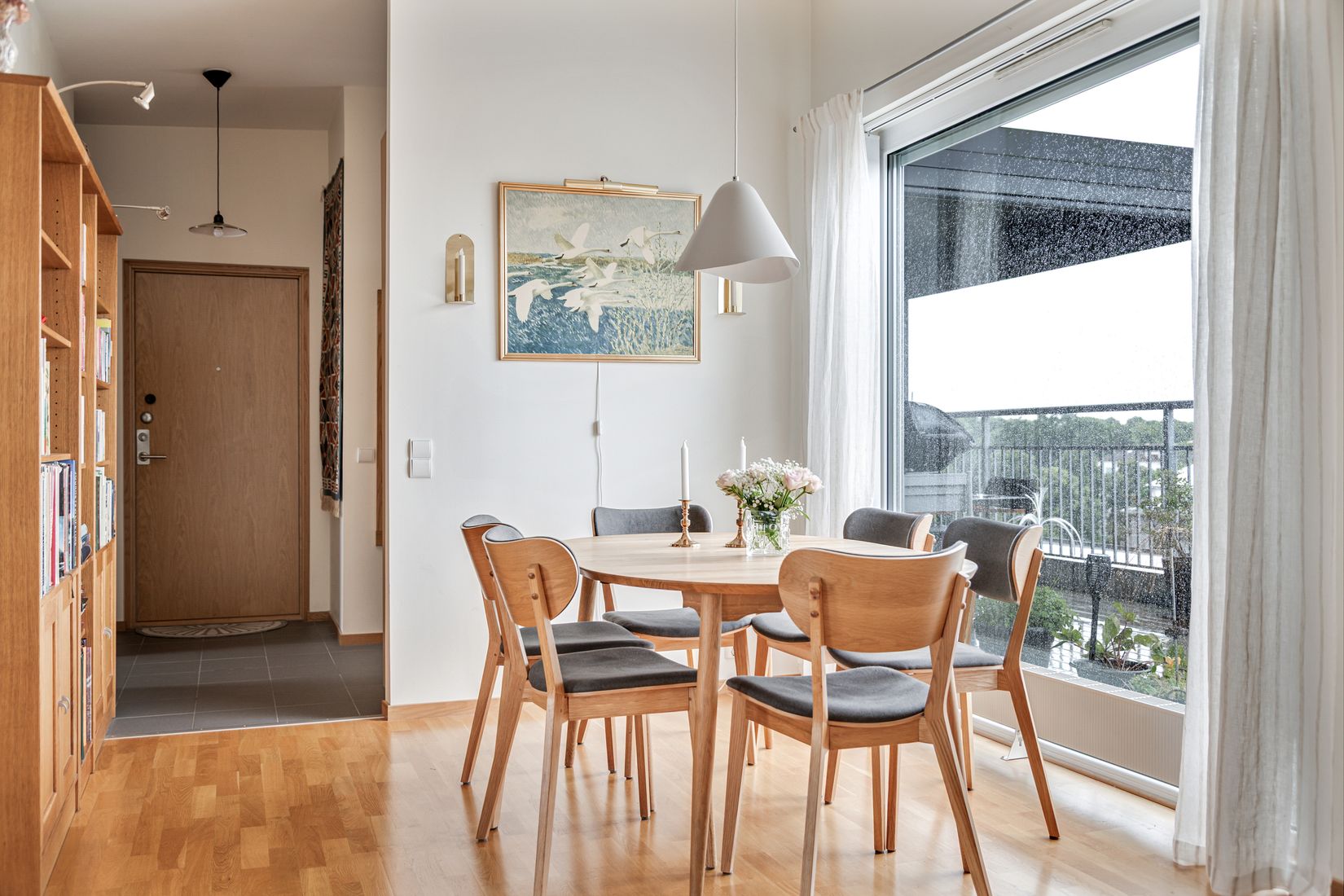 Bostadens planlösning är genomtänkt. Entrén möts av ett stengolv i diskret ton, gott om förvaring i garderober samt ljusa väggar som förstärker känslan av rymd. Vardagsrum och kök är i öppen planlösning och ljusinsläpp med i två väderstreck. Här finns plats för både soffgrupp och matplats – en yta som fungerar lika bra för vila som för umgänge.