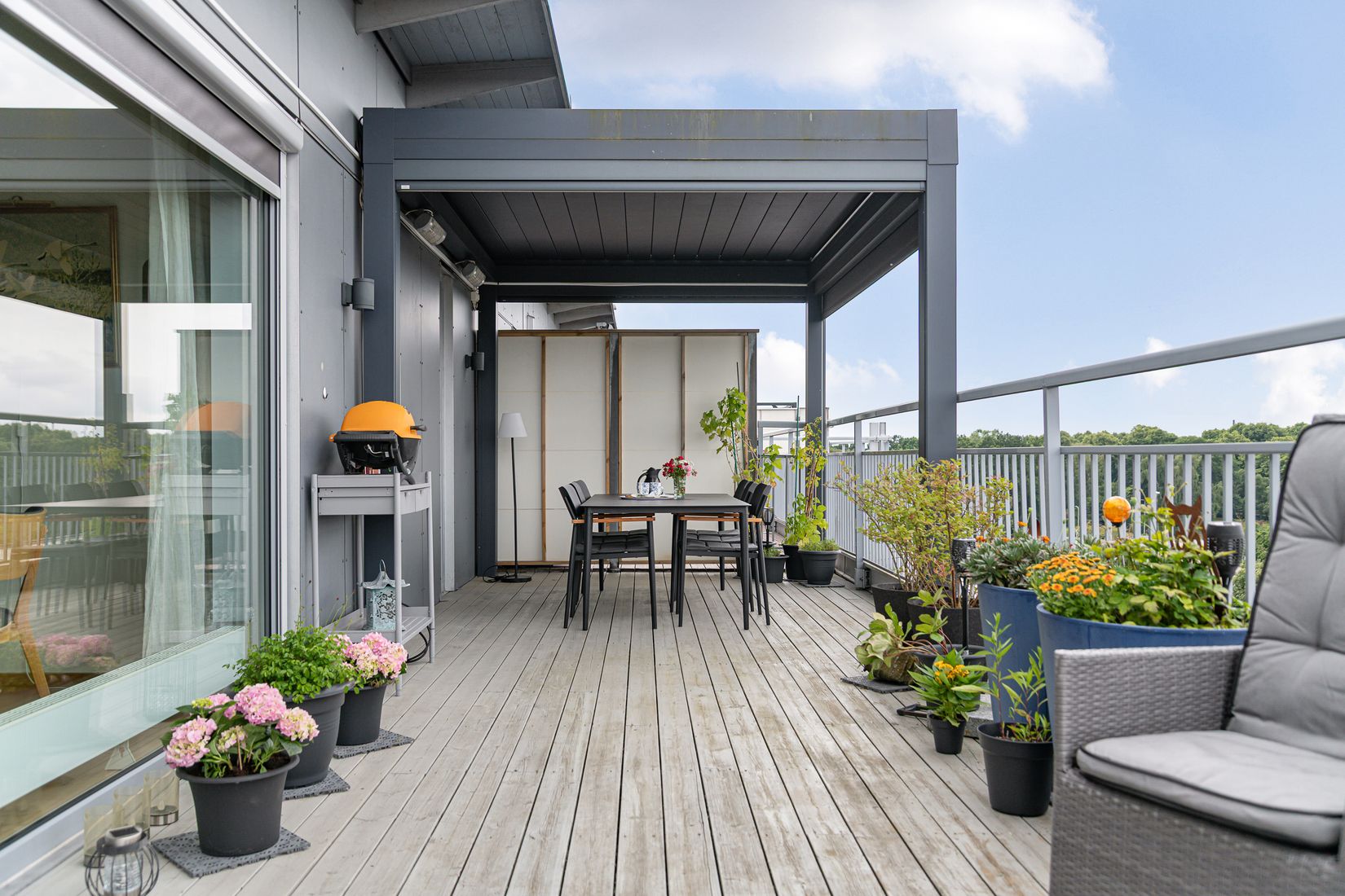 Från vardagsrummet når man en synnerligen generös takterrass om ca 40 kvm – en plats som erbjuder sol större delen av dagen. Här finns gott om utrymme för såväl för odling som utemöbler; men framför allt för - sommarkvällar med utsikt över stadens takåsar.