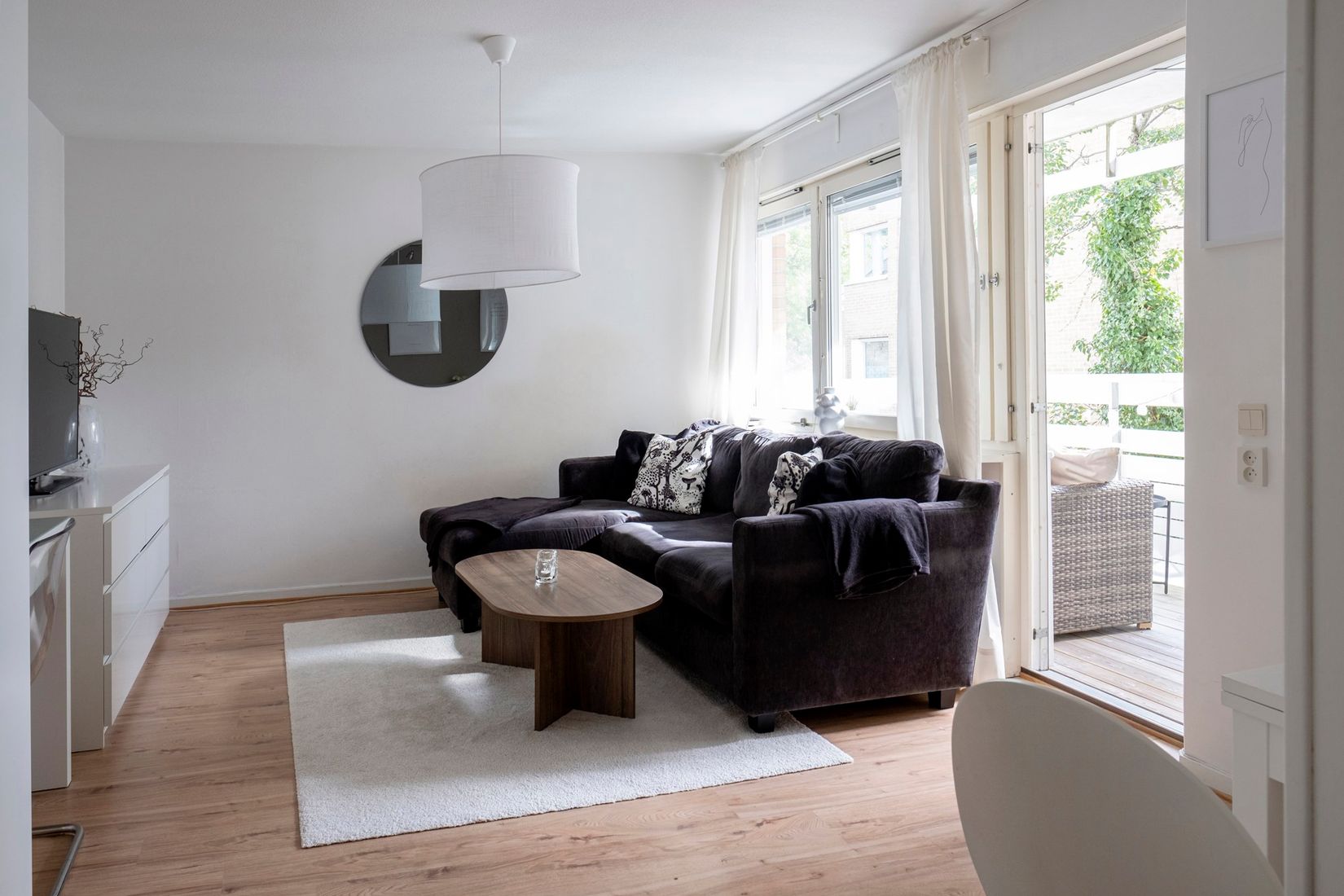 Lägenheten präglas av ett ljust och modernt uttryck med sociala ytor och smart planering. Vardagsrummet är luftigt och inbjudande, med generöst ljusinsläpp och utgång till en balkong i trevligt solläge – perfekt för morgonkaffet eller avkopplande kvällar.