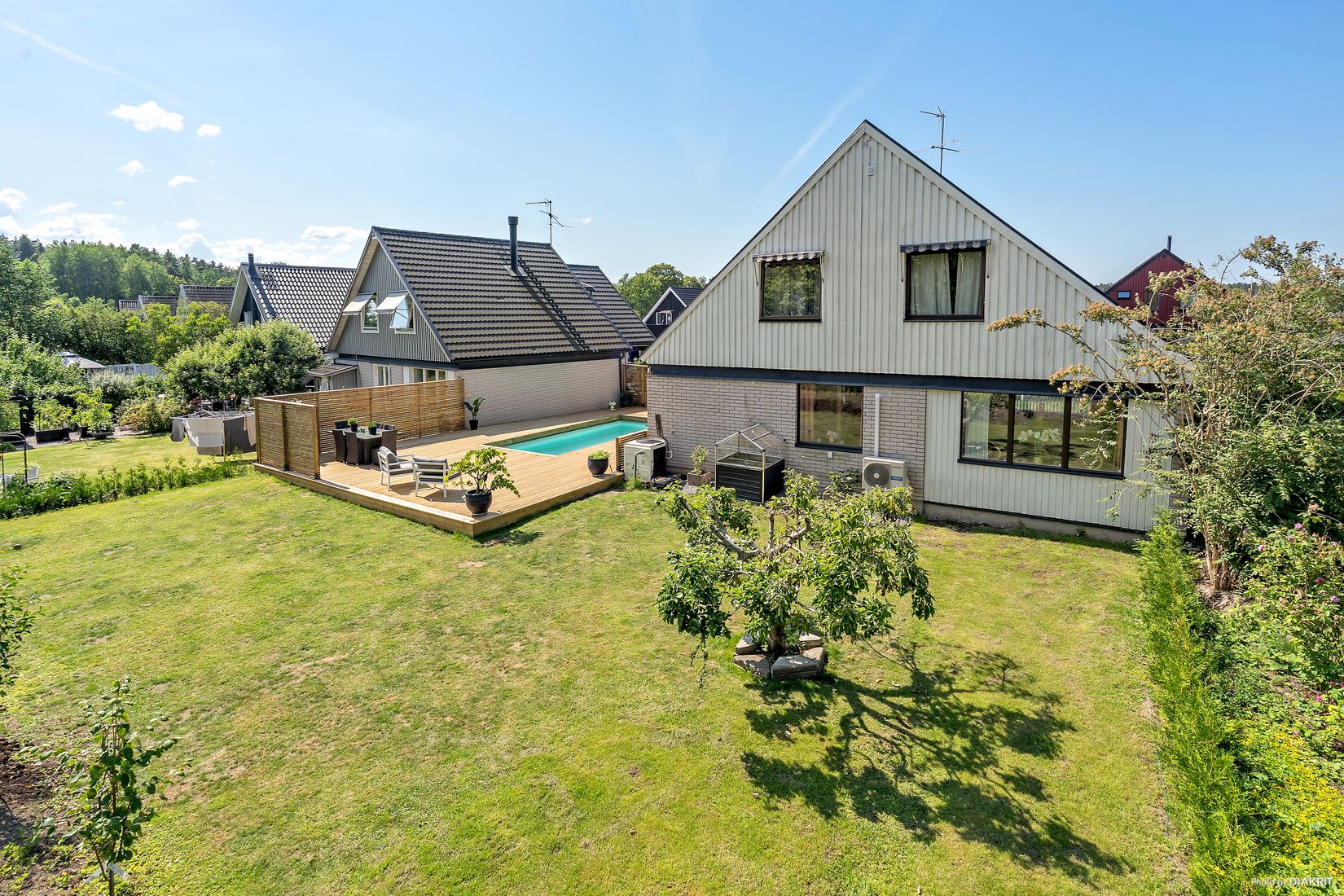 På baksidan väntar en riktig sommardröm med stor gräsmatta och ett snyggt trädäck med pool som förgyller vardagen och bjuder in till soliga dagar, svalkande dopp och trevliga kvällar med familj och vänner. Även framsidan erbjuder gräsmatta samt en praktisk uppfart med plats för flera bilar framför garaget, som dessutom har smidig ingång direkt från huset.