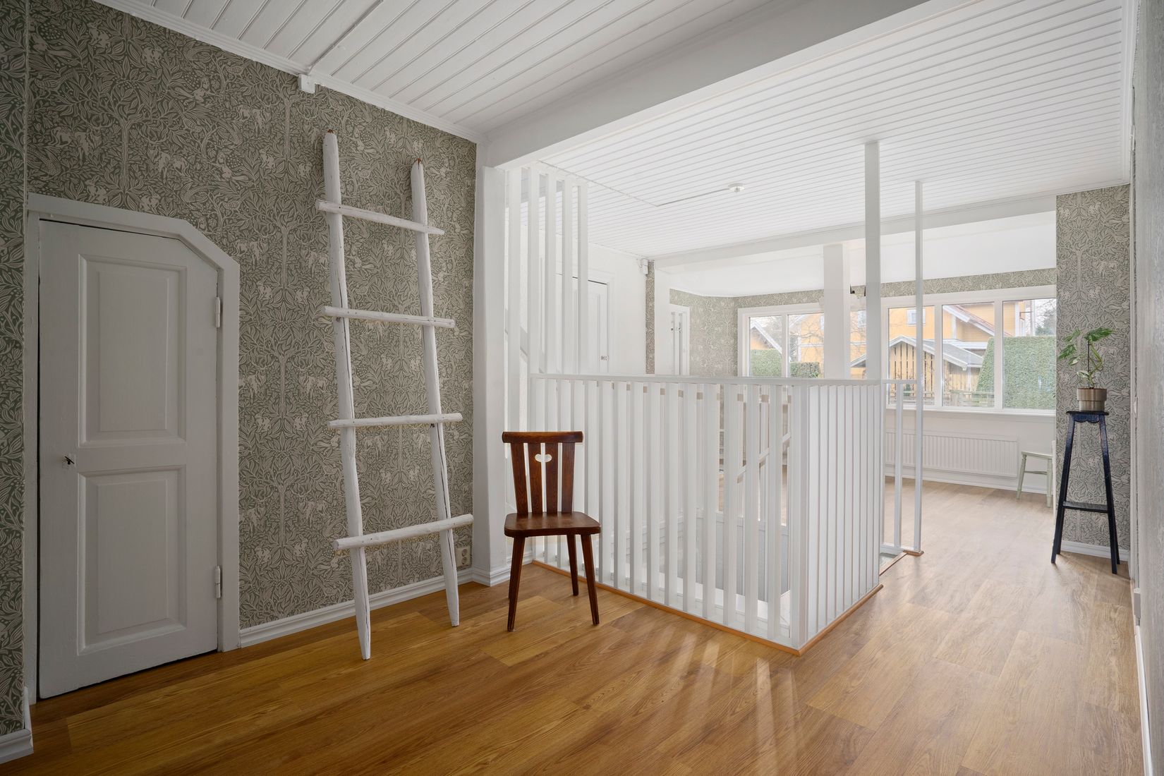 På andra våningen uppför trappan till vänster möts du av vardagsrummet med gott om utrymme för soffa och tv-möbler. Med braskaminen som ger extra trivsel kan du dessutom njuta av årets kallare dagar. Väggarna är vita med en mörkare grön fondtapet samt parkettgolv.
