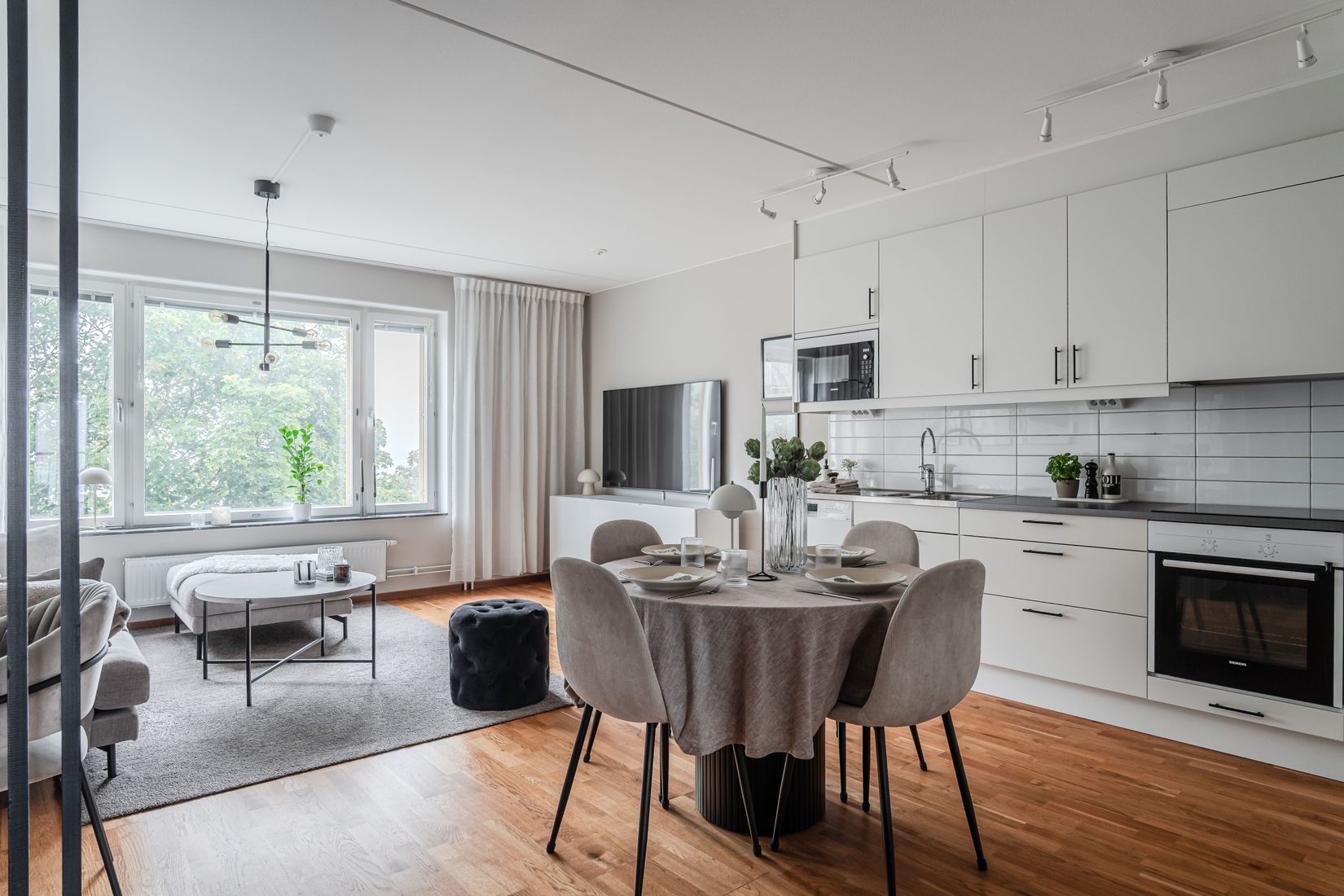 Lägenheten består av en hall med bra förvaringsmöjligheter i skjutdörrsgarderober, ett kök i öppen planlösning mot vardagsrummet med plats för både matbord och soffgrupp, ett fräscht helkaklat badrum med tvättmöjligheter samt ett sovrum som leder ut till balkongen.
