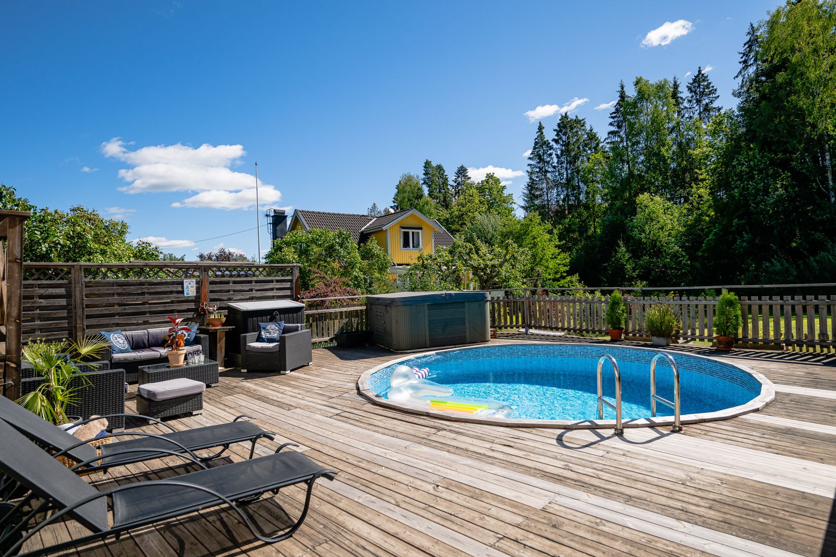 Välkomna till denna tegelvilla med nytt tak där solceller och bergvärme ger låga driftskostnader. Huset rymmer många sovrum, flera badrum och stora sällskapsytor, bilen kan stå skyddad i både garage och carport. Tomten ligger, trots sitt centrala läge, insynsskyddat från både grannar och väg och poolaltanen har ett soligt läge hela dagen.