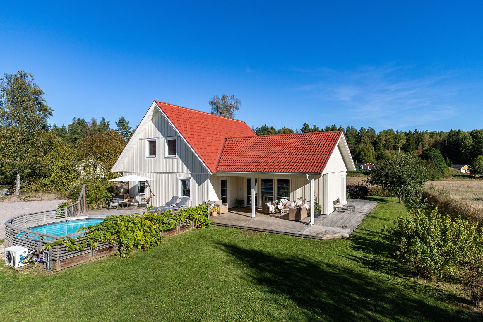 Trädgården är en riktig oas med flera trevliga uteplatser och ett generöst poolområde – perfekt för både lata sommardagar och sociala tillställningar. På tomten finns även ett stort garage med en praktisk uthyrningsdel i två plan – idealiskt för tonårsbarn, gäster eller som extra inkomstkälla.