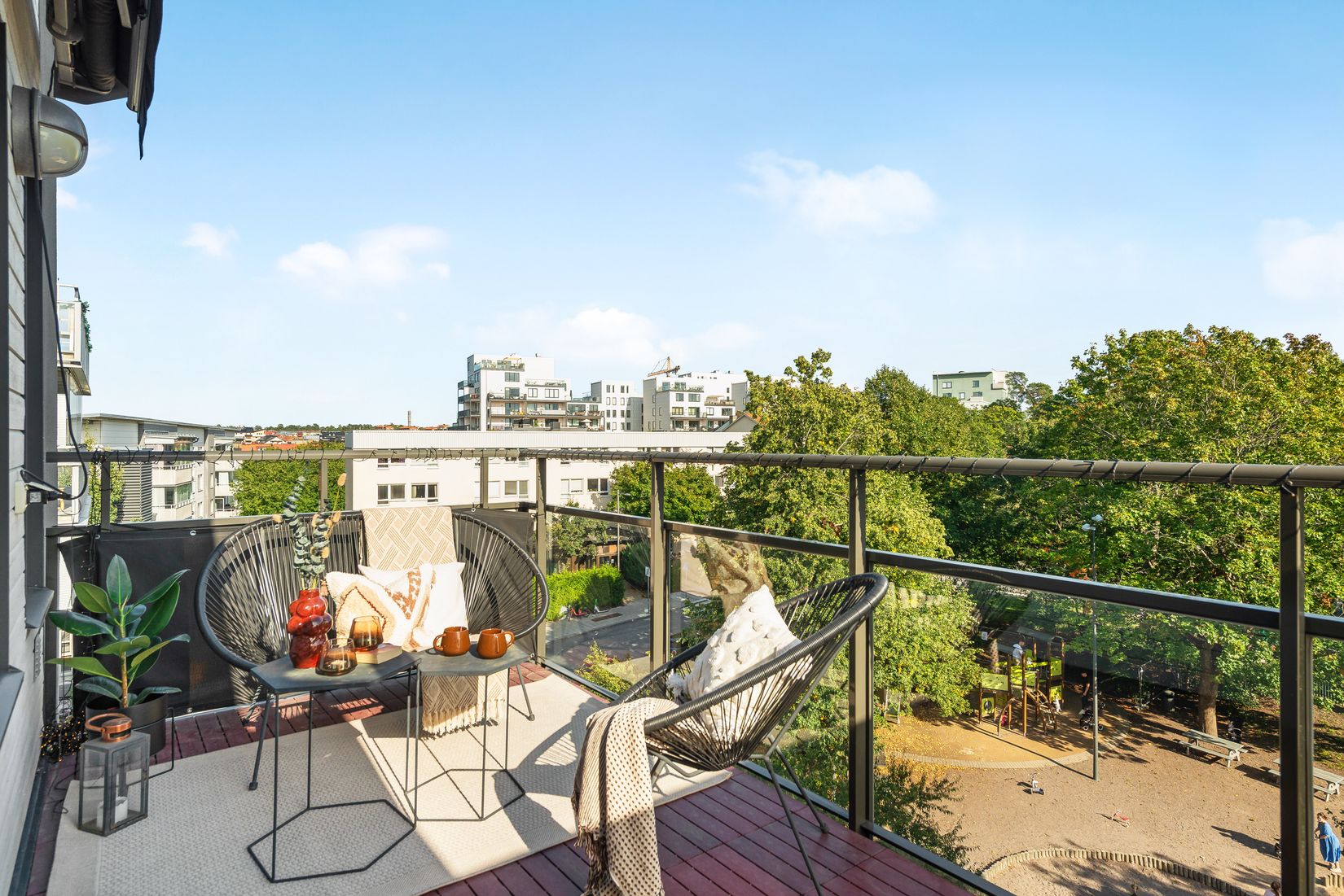 Från terrassbalkongen ges en magnifik vy över Bubbelparken, Mariehälls hustak och trädtoppar. Den generösa kvadratmeterytan gör det möjligt att möblera med utegrupp, grill, odlingslådor och växter. Här finns även en eldriven markis installerad för att skapa solskydd under de riktigt varma sommardagarna.