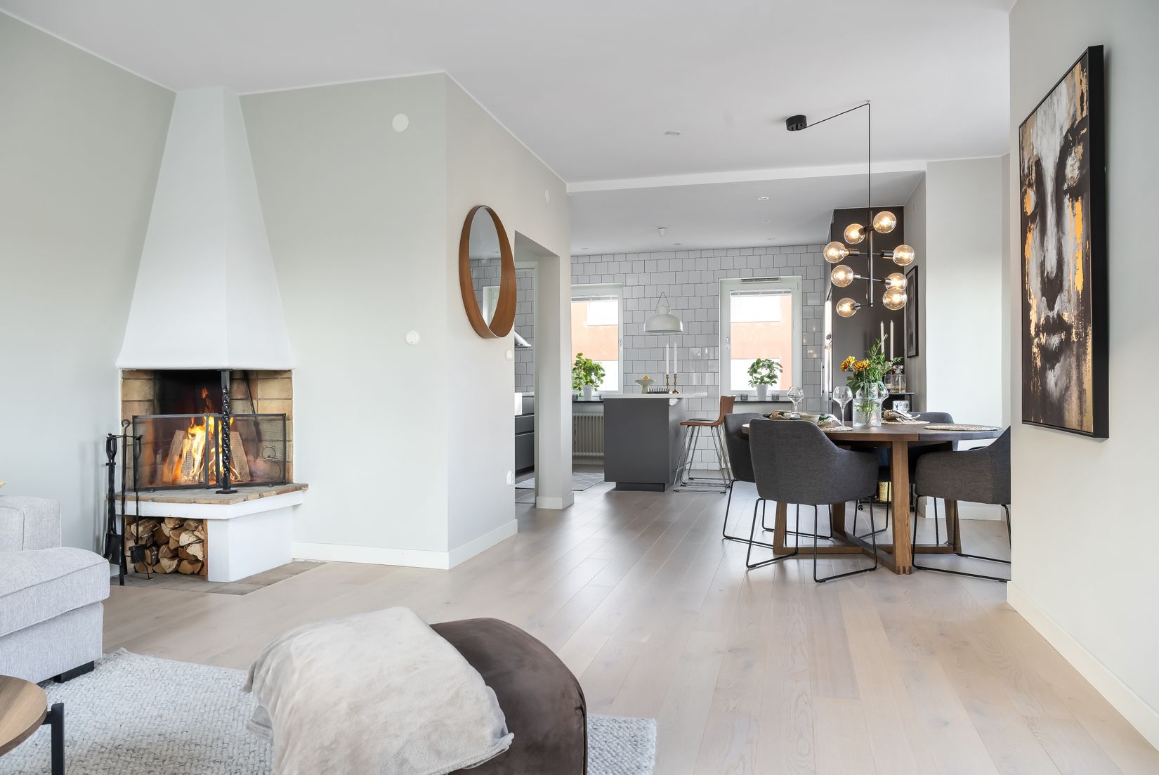 Här möts du av en smakfullt renoverad bostad där inget har lämnats åt slumpen. Hantverksmässigt utförda arbeten, genomgående uppdaterade ytskikt och ett fantastiskt ljusinsläpp tack vare fönster i tre väderstreck gör detta till ett hem att trivas i från första stund. Lägenheten ligger på andra våningen av tre och erbjuder en ovanligt rymlig planlösning med gott om sociala ytor. Här finns plats för både vardagsliv och umgänge, vilket gör att bostaden upplevs som större än sina 72,5 kvadratmeter.