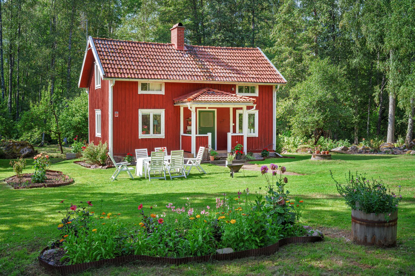 Tomten är lummigt grönskande med skogen som granne. Här finns fruktträd, bärbuskar och blomsterprakt att njuta av.
