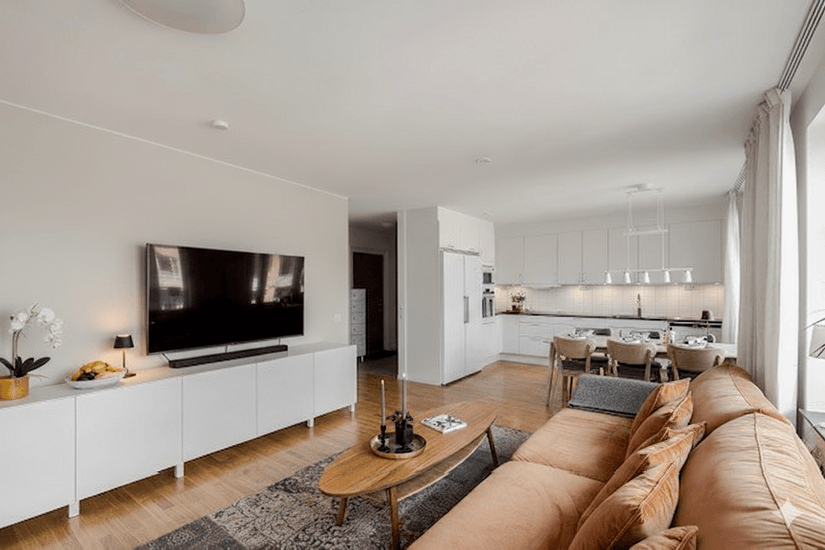 Lägenheten bjuder på en social öppen yta mellan kök och vardagsrum där det finns gott om plats för både matgrupp, soffhörna och tv-möbel. Från vardagsrummet nås även balkongen som vetter mot den lugna innergården med ett gemensamt orangeri. Två rymliga sovrum med plats för dubbelsäng. Genomgående parkettgolv skapar en harmonisk helhet och bidrar till den stilrena känslan.