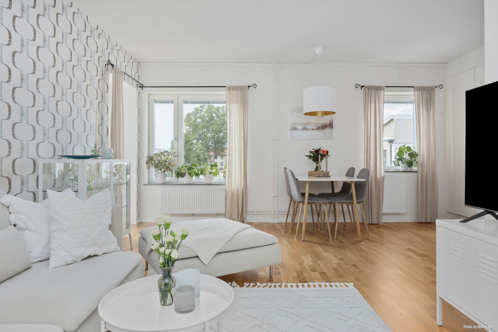 Lägenheten erbjuder en hall med tre garderober, ett sovrum med ytterligare två garderober samt ett luftigt vardagsrum i öppen planlösning mot köket. Köket är stilrent med vita släta luckor och rostfria detaljer, komplett utrustat. Från vardagsrummet når du balkongen, perfekt för sköna stunder.