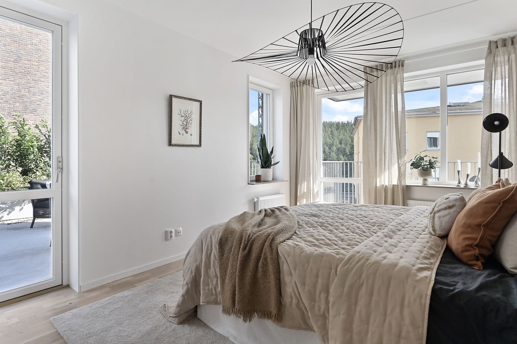 Sovrummet är väl tilltaget och har en praktisk skjutdörrsgarderob. Här finns även access till terrassen samt utgång till balkongen mot den finplanterade innergården och Svindersviken.