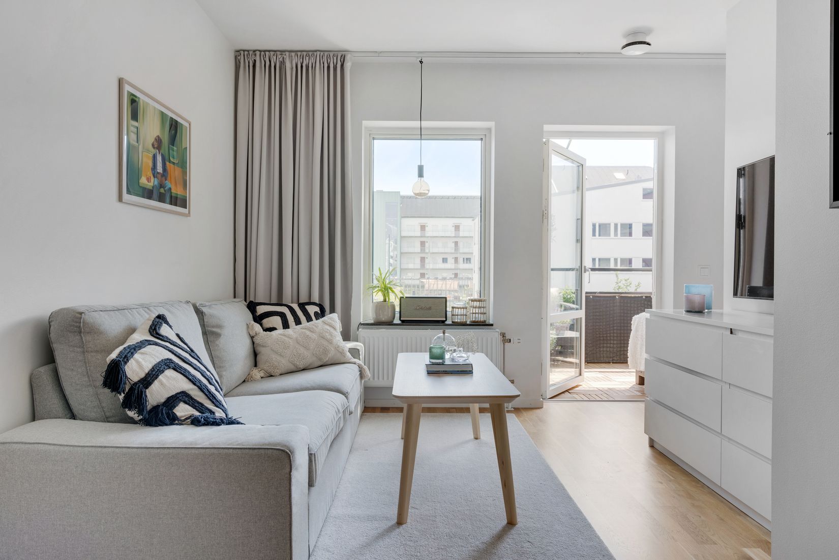 På våning tre finner du denna ljusa och välplanerade 1,5:a med en solig balkong i söderläge. Här kan du börja dagen med en kopp kaffe i stillhet och avsluta kvällen med att njuta av utsikten över föreningens grönskande innergård. Balkongen blir en naturlig förlängning av vardagsrummet och erbjuder en härlig plats för både avkoppling och sociala stunder.