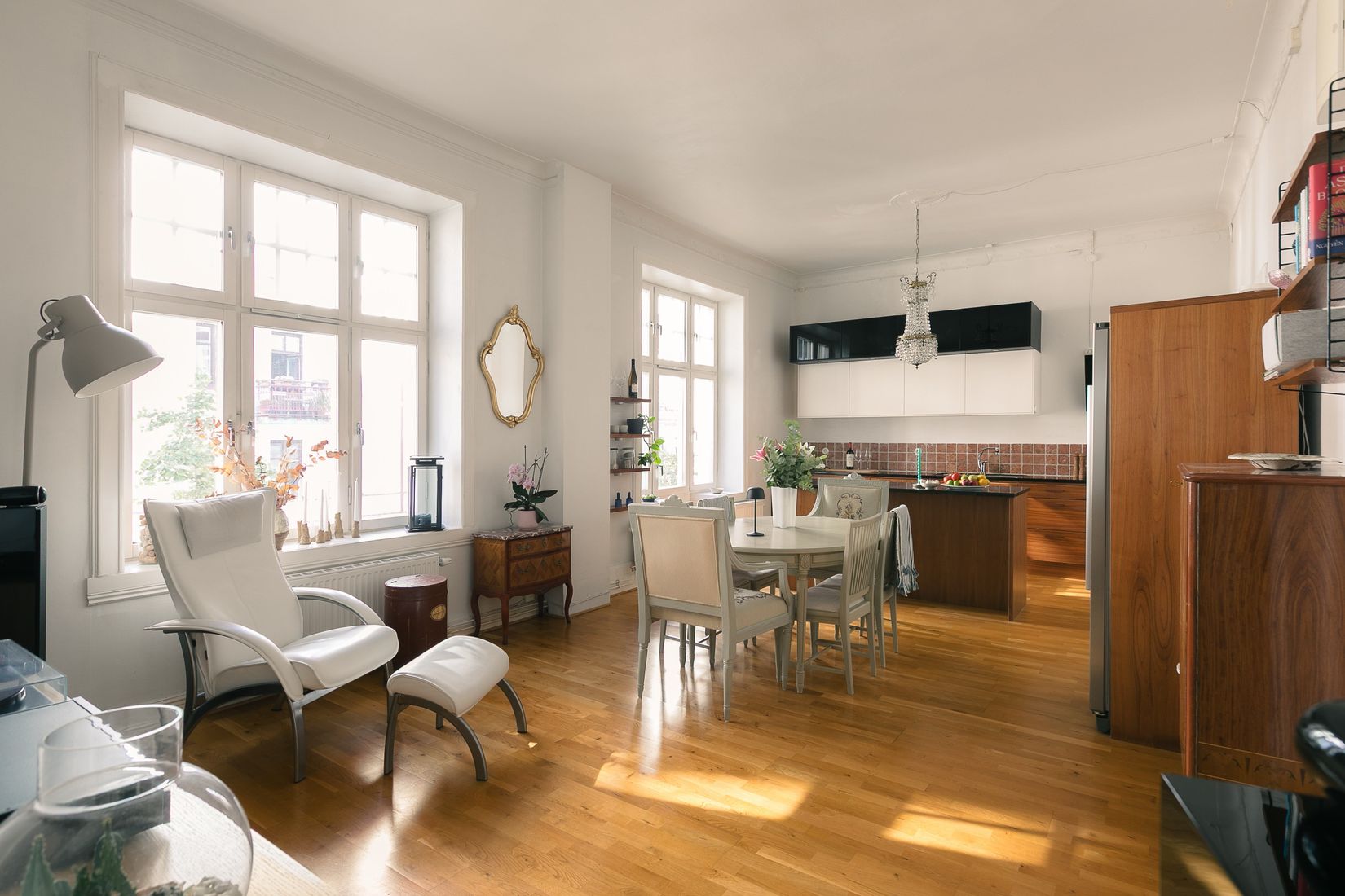 Det stora rummet där kök och sällskapsrum möts är bostadens självklara hjärta – en luftig och social yta där matlagning, samtal och umgänge får ta plats i en öppen och avslappnad atmosfär. Längst in i lägenheten ligger det största sovrummet med fönster ut mot föreningens innegård. Här finner man ro och plats för vila och sömn. De två andra rummen ligger i andra änden av lägenheten och går att inreda flexibelt för dig som kanske behöver ett extra sovrum, arbetsrum eller kombinerad yta för hobby och vila.