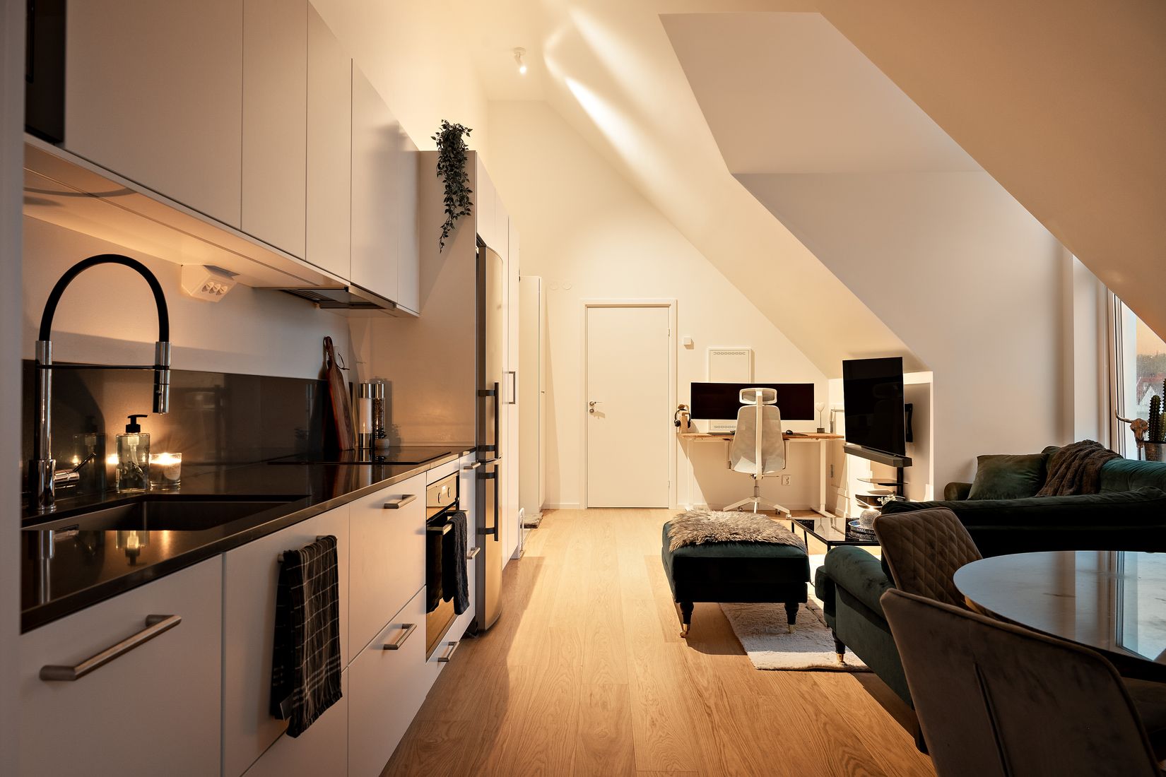 Bostaden har en välplanerad planlösning med ytor för både umgänge och avkoppling. Ljuset flödar in från de stora fönsterpartierna och takvåningskänslan gör att varje rum får en extra dimension av rymd och trivsel. Utöver detta har säljaren gjort flera smakfulla tillval som höjer både känslan och funktionen i hemmet – här flyttar du in i ett boende med det lilla extra redan från start.