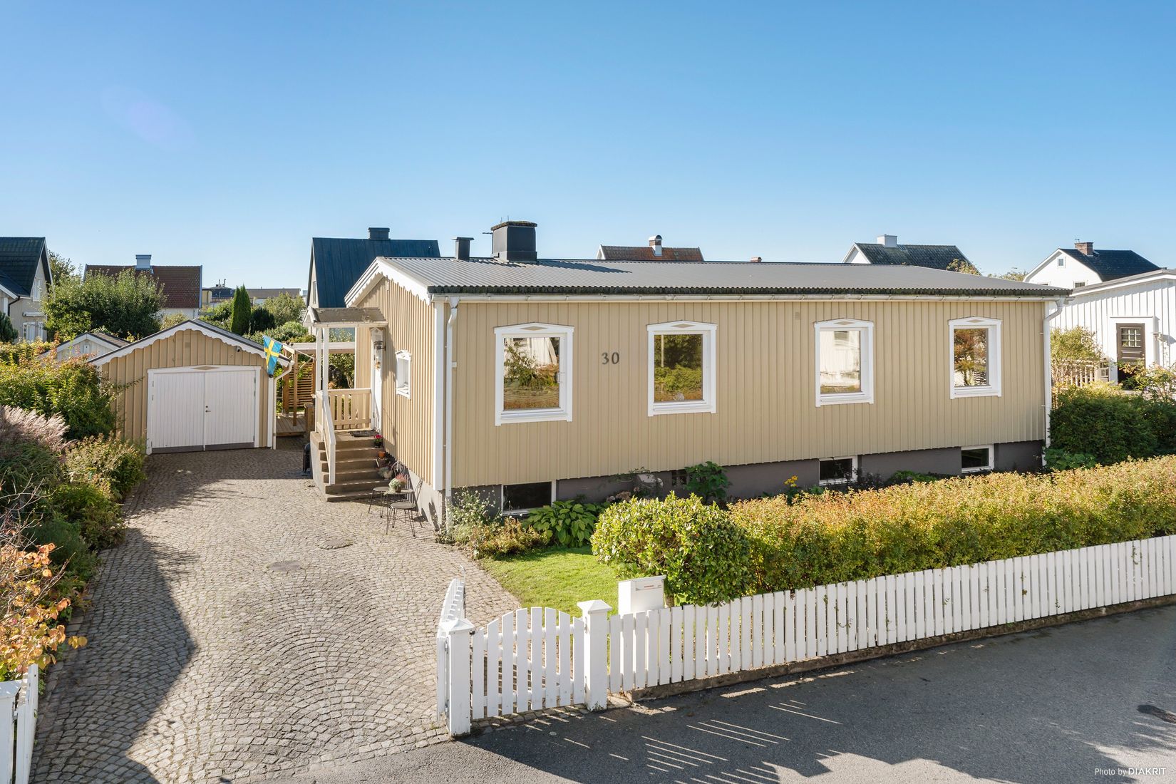 När vi öppnar den vitmålade grinden möts vi av en vacker kullerstensbelagd uppfart som leder till en välskött trädgård med massor av vackra växter, utekök med altan och pergola samt ett ljuvligt inglasat uterum. Friggeboden erbjuder gott om förvaringsutrymme och garaget en plats för bilen, extra förvaring eller din hobby.