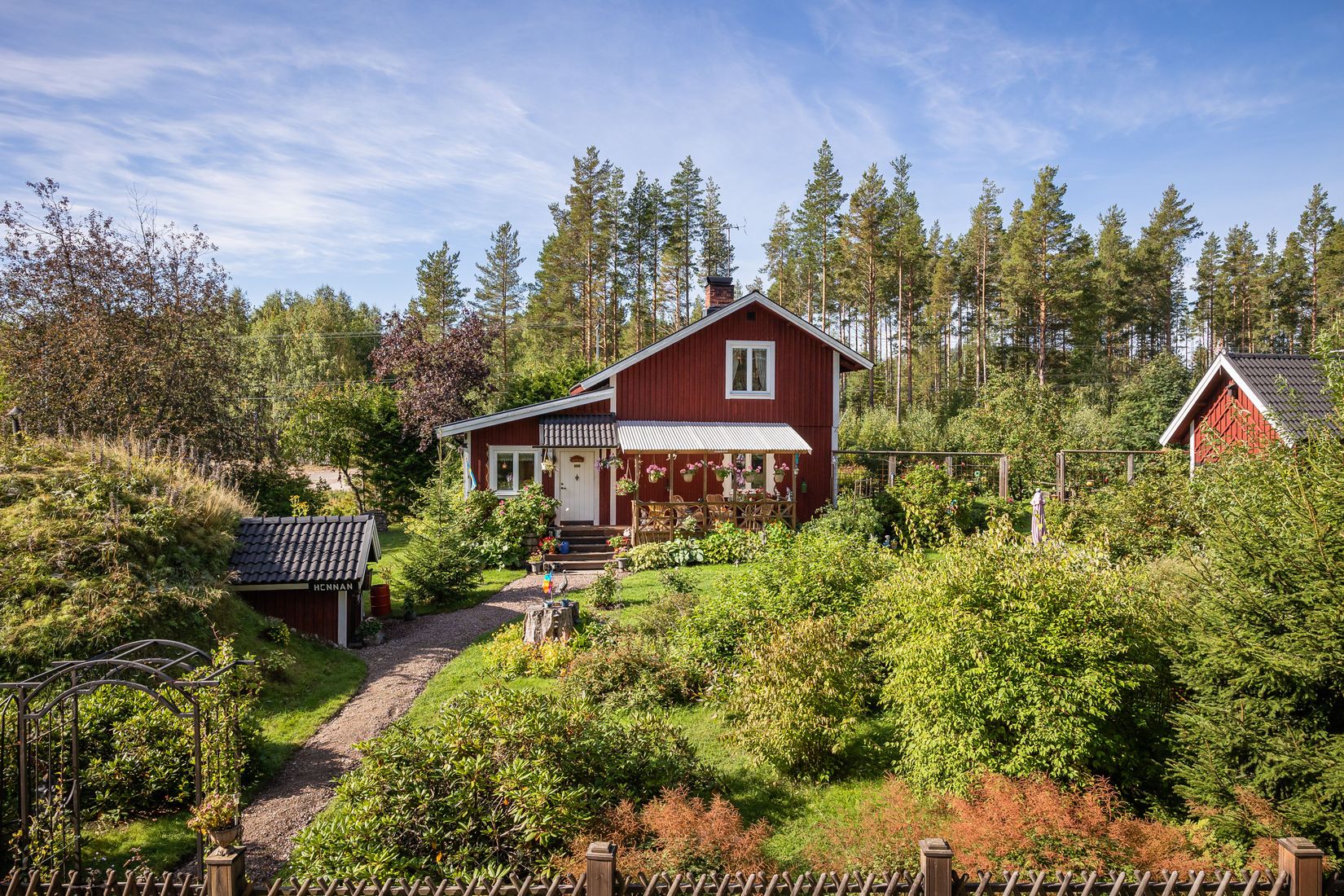 Tomten och trädgården är väl genomtänkt, anlagd med uppdelning på en del blomsterträdgård med härliga rabatter och blommor, en del fruktträdgård med bland annat äppelträd, plommonträd, krusbär och rabarber, på tomten finns finns även potatis-, grönsaksland.