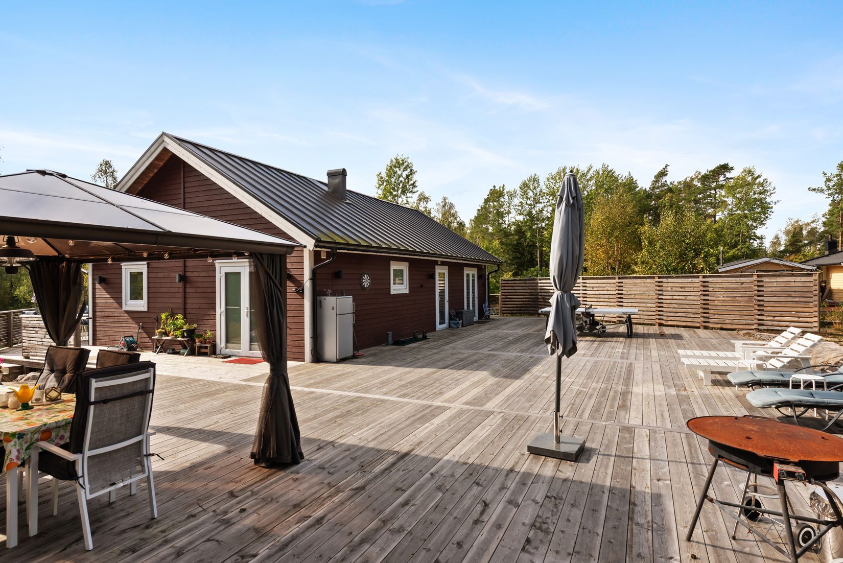 Komforten är genomgående hög med golvvärme i hall och badrum, luft–luftvärmepump som ger både värme och kyla, samt elradiatorer i sovrummen som sällan behövs tack vare husets energieffektiva konstruktion. Runt huset sträcker sig en ca 250 kvm stor altan i flera nivåer som följer bergets form och bjuder in till grillkvällar, avkoppling i solen och umgänge med familj och vänner. Nere vid vattnet finns en vedeldad bastu, en ny bad- och båtbrygga från 2024 samt båtplats med boj – den perfekta utgångspunkten för både bad och båtliv.