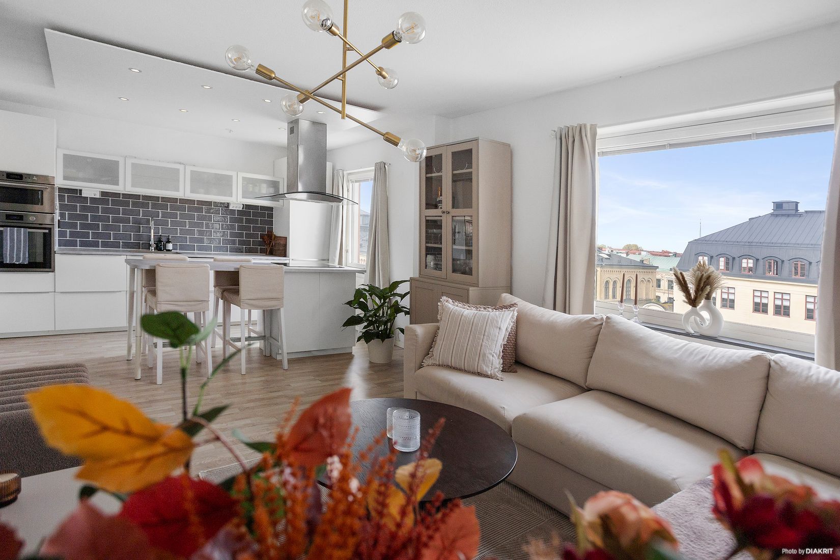 Lägenheten ligger högst upp i huset och bjuder på en härlig utsikt mot Domkyrkan, helt utan insyn. Här får du ett stilrent kök från 2015 i öppen planlösning mot vardagsrummet. En social yta som passar lika bra för plugget som för middagar med vänner. Det fräscha, helkaklade badrummet från 2019 är utrustat med tvättmaskin och sovdelen rymmer både säng och gott om förvaringsmöjligheter.