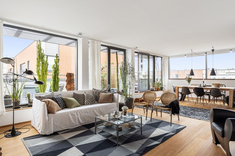 I det rymliga vardagsrummet finns plats för både soffgrupp och stort matbord som vänner och familj kan samlas runt. De stora fönsterpartierna öppnar upp mot terrassen och släpper in ett överflöd av ljus.