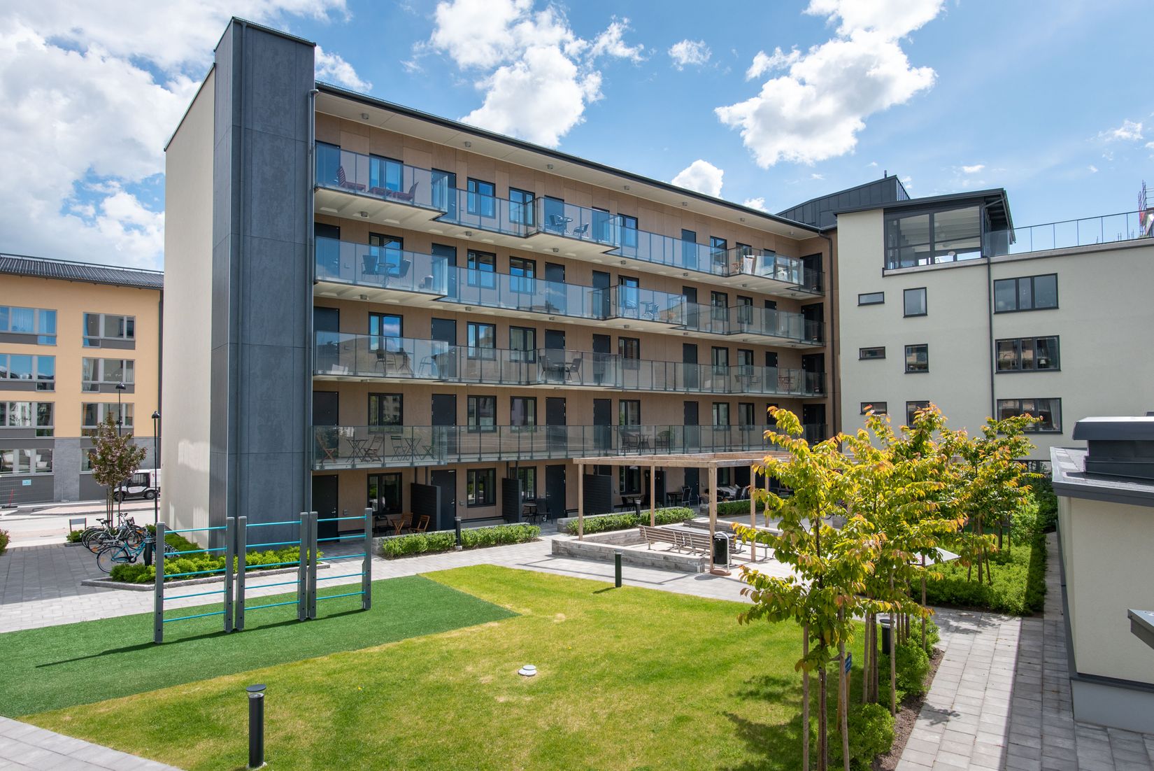 För föreningens medlemmar finns en gästlägenhet att hyra (250 kr/natt) och gemensam terrass med vinterträdgård att nyttja. På innergården finns utomhusgym, hängmatta, bänkar, cykelverkstad. Cykelförråd finns i separat byggnad på gården och barnvagnsrum finns i entréplan.