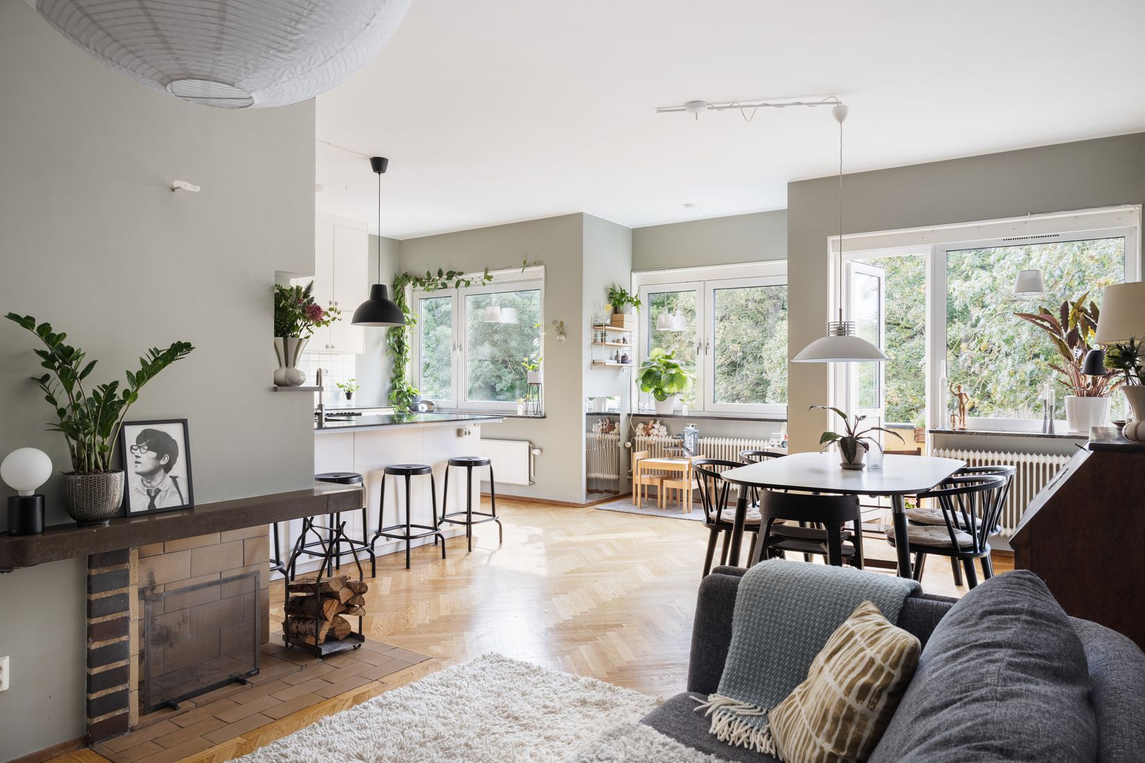 Under senare år har bostaden renoverats med ett stilsäkert grepp samtidigt som den härliga funkisgrunden aldrig satts åt sidan. Kombinationen mellan gammalt och nytt är träffsäker och här finns många trevliga attribut bevarade så som den öppna spisen och det trevlig originalgolvet i fiskbensmönster. Höjdpunkter i bostaden är givetvis det sociala mötet mellan kök och vardagsrum där en köksö binder ihop ytorna. Ytterligare en modern lösning mitt i prick är det renoverade och utbyggda badrummet som erbjuder dubbla tvättställ, bra förvaringsmöjligheter och egna tvättmöjligheter.