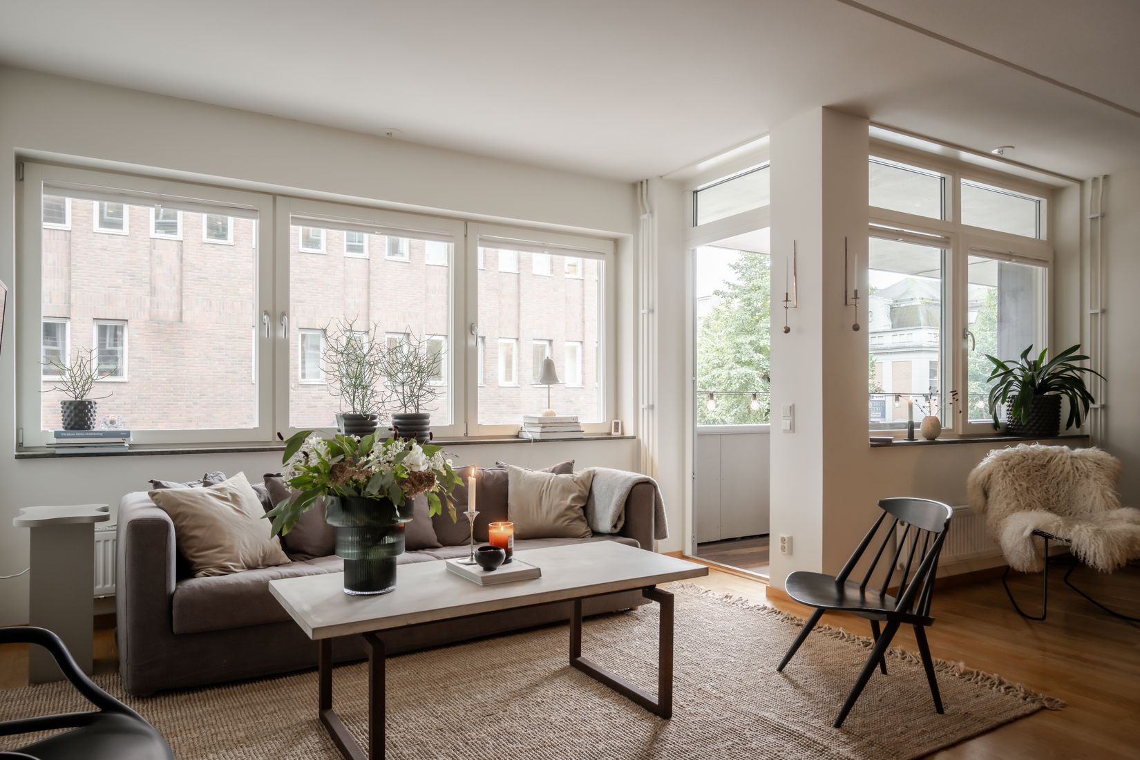 På bekvämt våningsplan erbjuds nu ett trivsamt och modernt hem fördelat på cirka 82 kvm med både balkong och uteplats. De genomgående ljusa ytskikten skapar en perfekt bas att inreda efter och sätta sin personliga prägel. Bostaden har ett rymligt kök i vinkel från Vedum med tidlös design och vitvaror i rostfritt utförande. För den som är vinintresserad finns en integrerade vinkyl som hjälper dig att hålla de optimala förhållandena för din vinsamling. Rymligt vardagsrum som på en trivsamt sätt integrerar med köket. Här finns god plats för matplats, soffa och övrig möblemang utan att det upplevs trångt. Via vardagsrummet når man balkongen som ligger skyddad under tak, en mysig plats att vistas på större delen av året. När kylan kryper sig på kan man koppla in infravärme som värmer gott. För den som uppskattar ett litet mer privat läge har bostaden även en mindre uteplats som ligger mot föreningens innergård. Här kan du sitta och njuta av lugnet trots stadspulsen runt hörnet. Bostaden har ett helkaklat fräscht badrum med både tvättmaskin och torktumlare. Det finns gott om förvaringsmöjligheter både i lägenheten och i ett tillhörande källarförråd.
