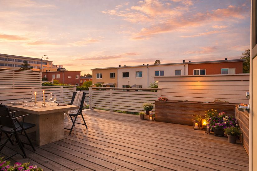Huset erbjuder en stor altan i bästa solläge och även altan med gräsmatta på husets baksida. Framsidan är trädäckad och rymlig nog för både matplats, solstolar och utegrill.