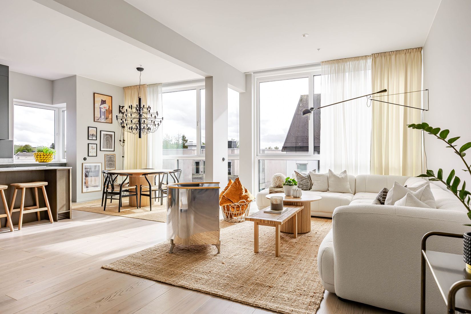 Lägenheten rymmer fyra rum, två helkaklade badrum och en separat tvättstuga – vilket ger praktiska lösningar för familjen, samtidigt som det bidrar till en hög vardagskomfort. Badrummen är inredda med kvalitetsmaterial och en modern design som håller över tid.