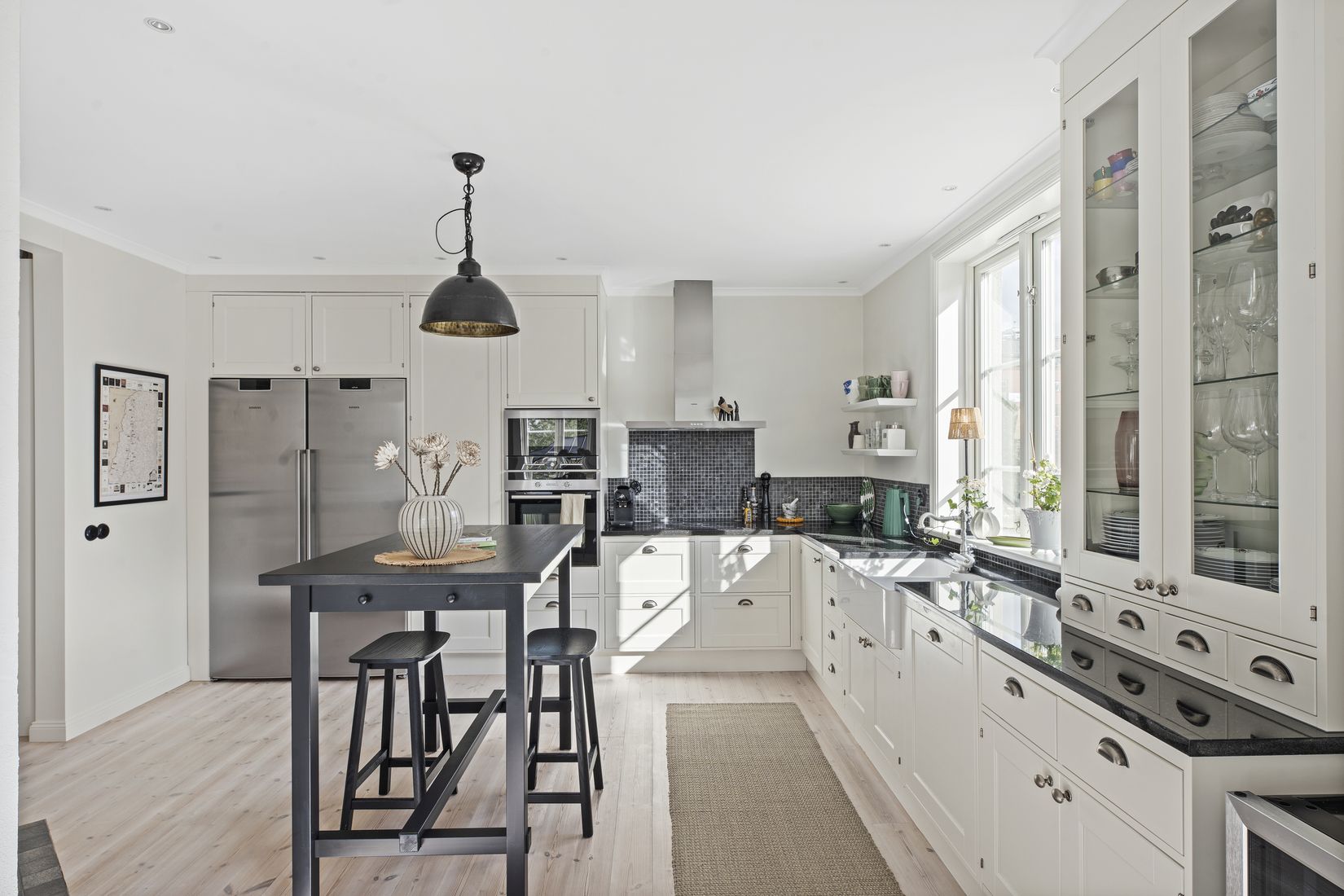 Genomgående i lägenhetens båda plan ligger det massiva vitpigmenterade trägolv från Dalafloda o spröjsade fönster. Ytskikten är i toppskick med platsmålade golvsocklar, taklister, vackra dörrfoder och spegeldörrar som förhöjer känslan av att bo i ett 20-tals hem.