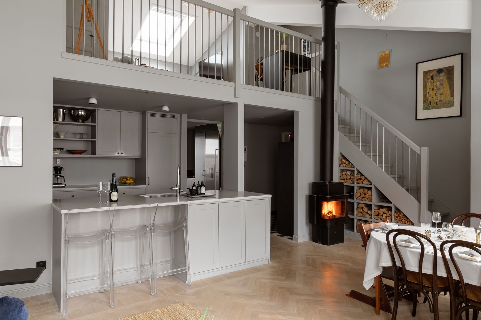 Här erbjuds ett svårslaget boende med härliga attribut såsom hela 5 meter i tak, stora höga fönsterpartier om 180 cm samt fungerande gjutjärnskamin.