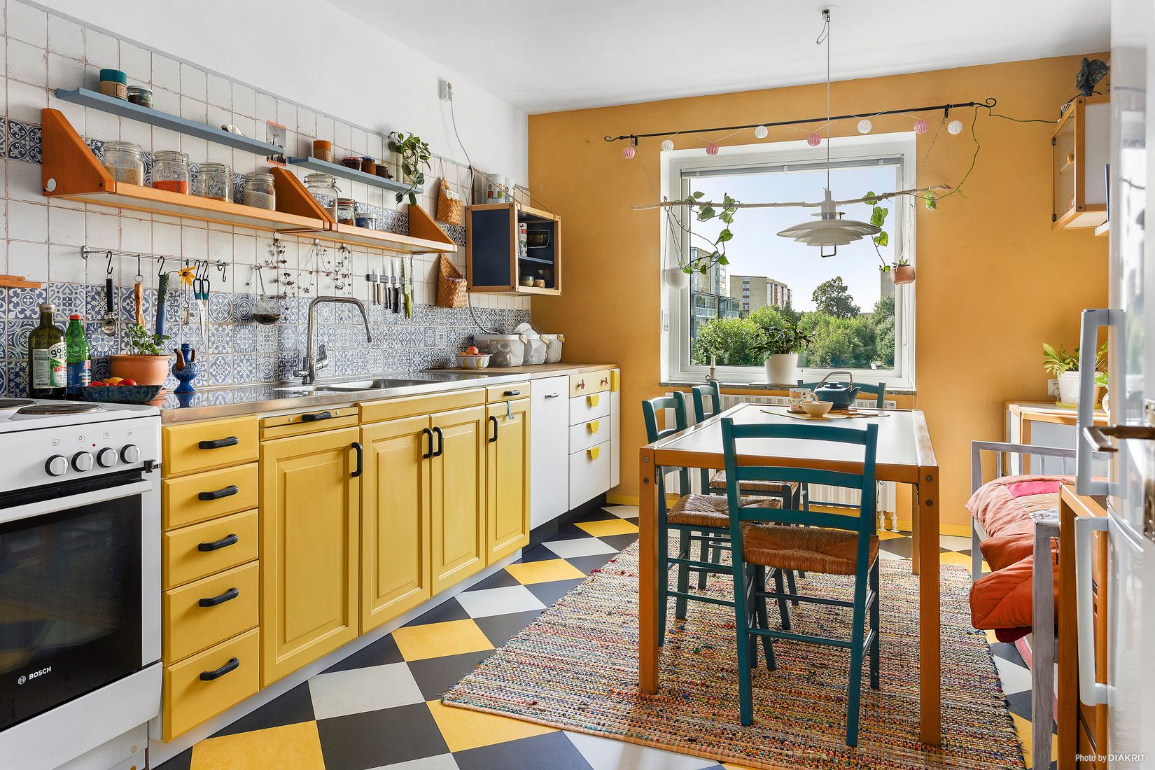 Lägenheten har varsamt renoverats med fokus på hållbarhet och naturliga materialval. Väggarna är målade i behagliga kulörer med miljövänliga färger, köket har fått nytt liv med en vacker bänkskiva i ek, charmiga spanska kakelplattor och både bevarade och nya köksskåp i tidlös design. På golven möts du av stilrena och slitstarka material som ger en modern känsla och samtidigt skapar en hälsosam inomhusmiljö som dessutom kan upplevas extra fördelaktig för personer med allergi.