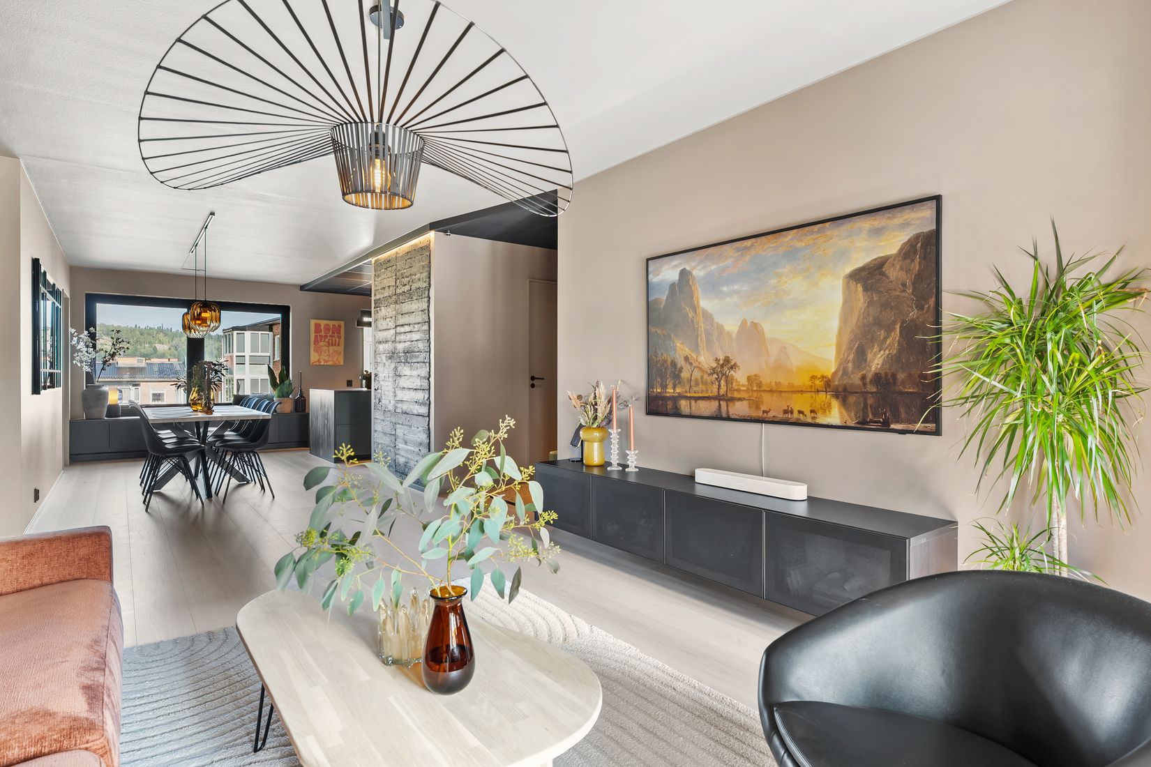 Hela lägenheten har fått ett enhetligt och sobert uttryck där inte en vit fläck lämnats åt slumpen – tak, dörrar, lister och garderober är omsorgsfullt inmålade. Den bärande betongväggen har tagits fram och behandlats med lasyr, vilket ger en vacker och stilren detalj som bryter av mot de övriga ytorna. Belysning från Philips HUE i kök, badrum och hall. Styrs via brytare och app. Man kan justera från varm till kallt ljus samt alla olika färger och färgscener.