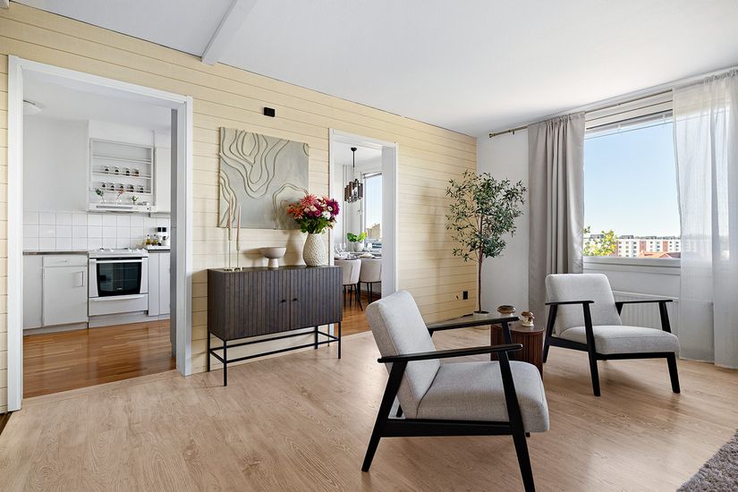 Bostaden erbjuder ett rymligt och luftigt vardagsrum där de stora fönsterpartierna släpper in gott om dagsljus och skapar en inbjudande känsla. Köket är praktiskt planerat och härifrån nås den inglasade balkongen - en plats att njuta av både vår som höst.