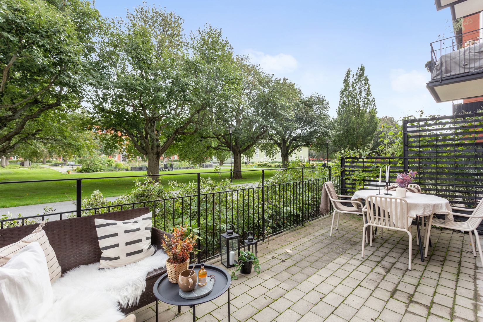 Den generösa uteplatsen blir som ett extra rum under sommarhalvåret – en perfekt plats för morgonkaffet eller helgens brunch i solen, med utsikt mot lugna och charmiga Klockhusparken.