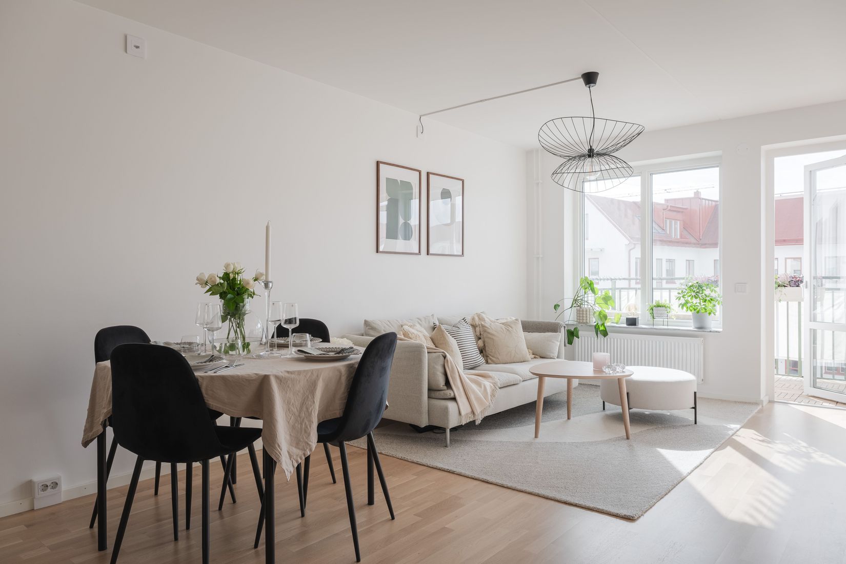 Den öppna planlösningen mellan kök och vardagsrum bjuder in till både sociala middagar och avkopplande hemmakvällar. Köket är utrustat med alla bekvämligheter du kan önska - integrerad diskmaskin, kyl/frys, ugn, spishäll och mikro. Vardagsrummet erbjuder gott om plats för möblering och leder dig vidare ut till den härliga balkongen i soligt söderläge.
