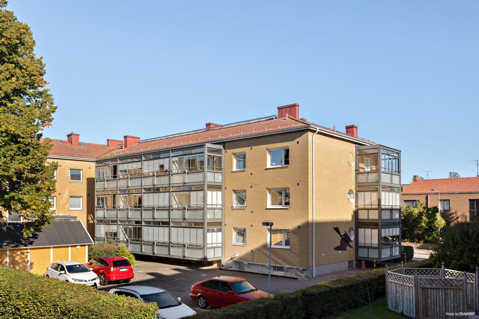På innergärden finns p-plats att hyra (kösystem tillämpas) om man inte väljer att ställa bilen på den allmänna parkeringen i området.