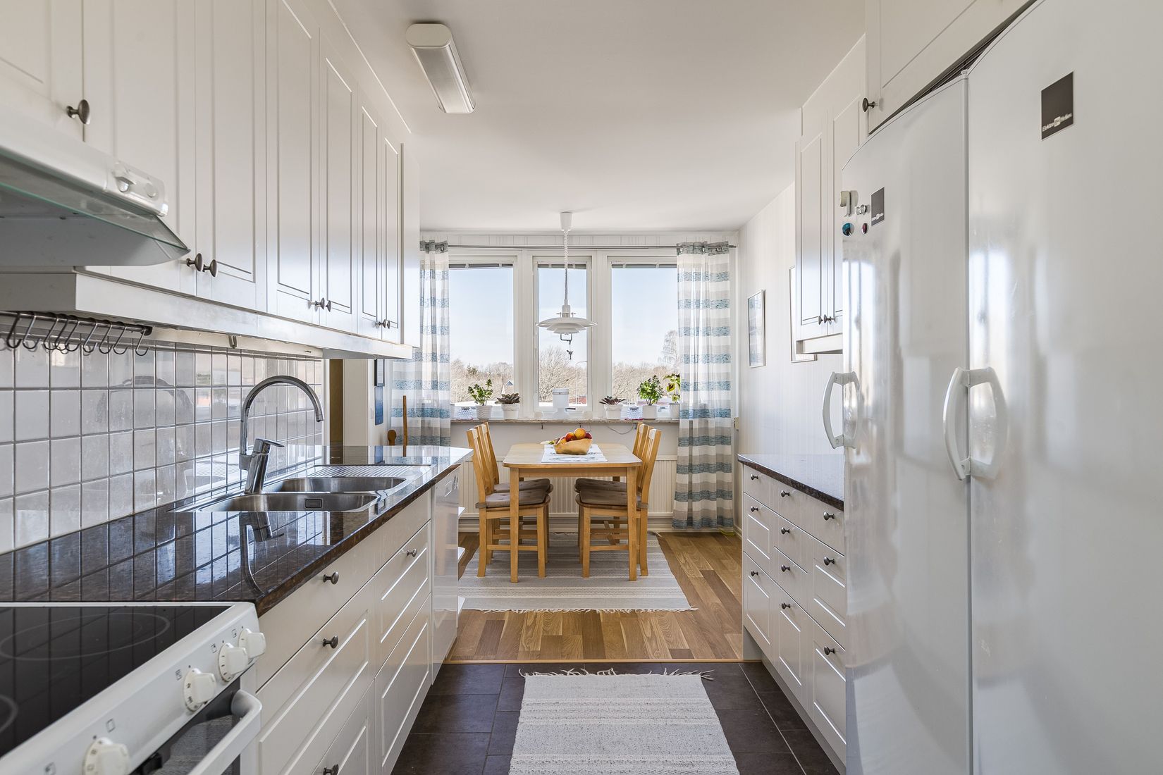 Lägenheten erbjuder generösa hallutrymmen, ett rymligt vardagsrum med stora fönsterpartier och utgång till en balkong i västerläge, här finns plats för utemöbler. Köket är välplanerat med bra arbetsytor och matplats för hela familjen. Här finns tre sovrum i bra storlek, ett badrum med tvättmöjligheter samt ett extra duschrum.