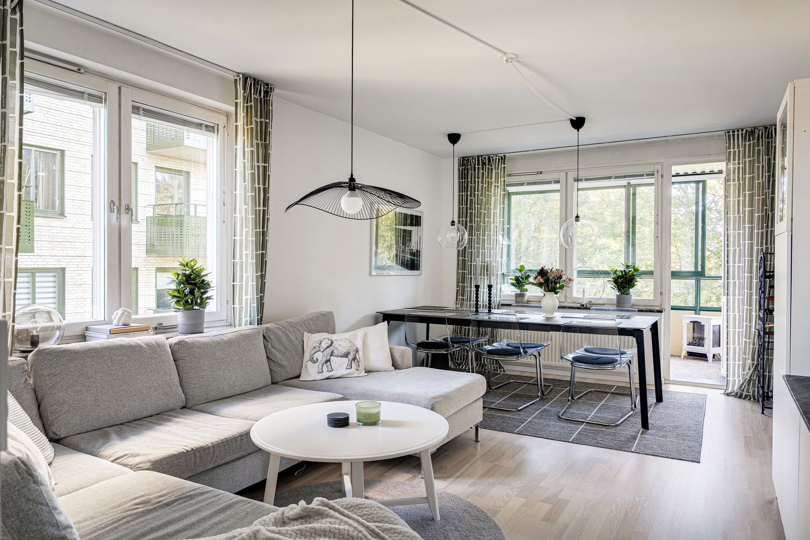 Bostaden erbjuder en rymlig hall med bra förvaring, två tilltagna sovrum med plats för både dubbelsäng och garderober samt ett generöst vardagsrum som enkelt möbleras efter behov. Från vardagsrummet nås den inglasade balkongen i soligt söderläge - en perfekt plats för både morgonkaffe och kvällsro. Köket är både snyggt och funktionellt, utrustat med full maskinpark, gott om förvaring och plats för matbord. Modern badrum med egen tvättmaskin och torktumlare (stambyttes 2006).