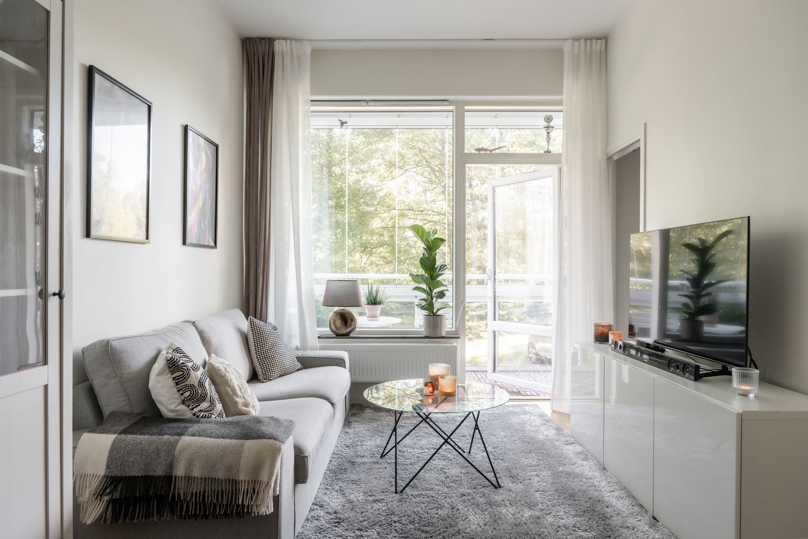 Innanför entrédörren möts du av den slående takhöjden på cirka 3 meter som ger bostaden en känsla av rymd. Den inglasade balkongen blir en naturlig förlängning av bostaden och ett extra rum större delen utav året. Här kan du sitta och njuta av lugnet och den grönskade utsikten medans solen gör dig sällskap på eftermiddagen. Bostaden har moderna och tidlösa materialval och ljusa enhetliga ytskikt vilket skapar en perfekt bas att inreda efter och sätta sin personliga prägel. Helkaklat fräscht badrum med både tvättmaskin och torktumlare. Rymligt kök i vinkel med gott om förvaring och bänkyta. Bra med förvaring finns i inbyggda garderober med praktiska skjutdörrar samt ett extra förråd belägen på samma våningsplan.
